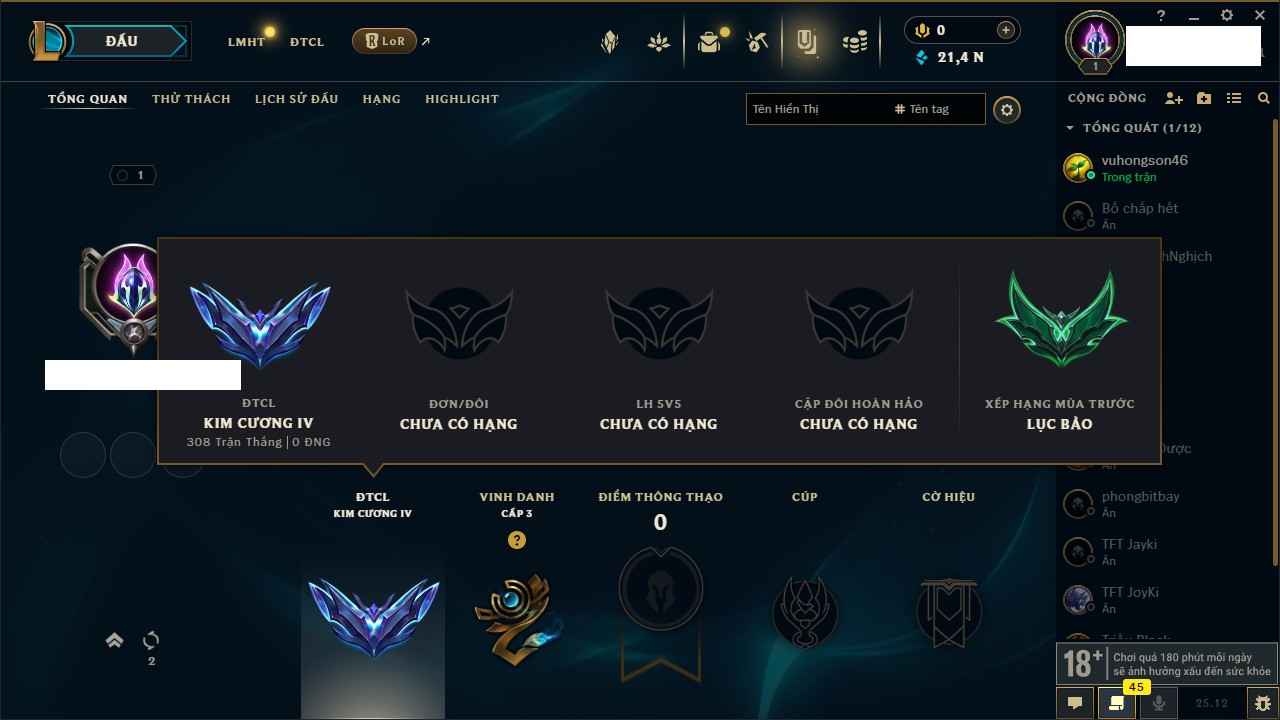 Rank Đơn: Bạc IIKhung: VàngTướng: 171 - Còn 332462 THXTrang Phục: 165Rank ĐTCL: Kim Cương IVLinh Thú: 181