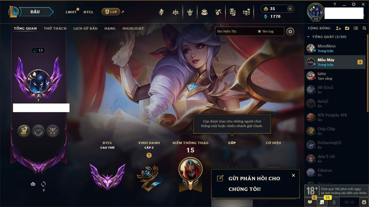 Rank Đơn: Vàng IKhung: BạcTướng: 171 - Còn 60584 THXTrang Phục: 286Rank ĐTCL: Vàng IIILinh Thú: 117