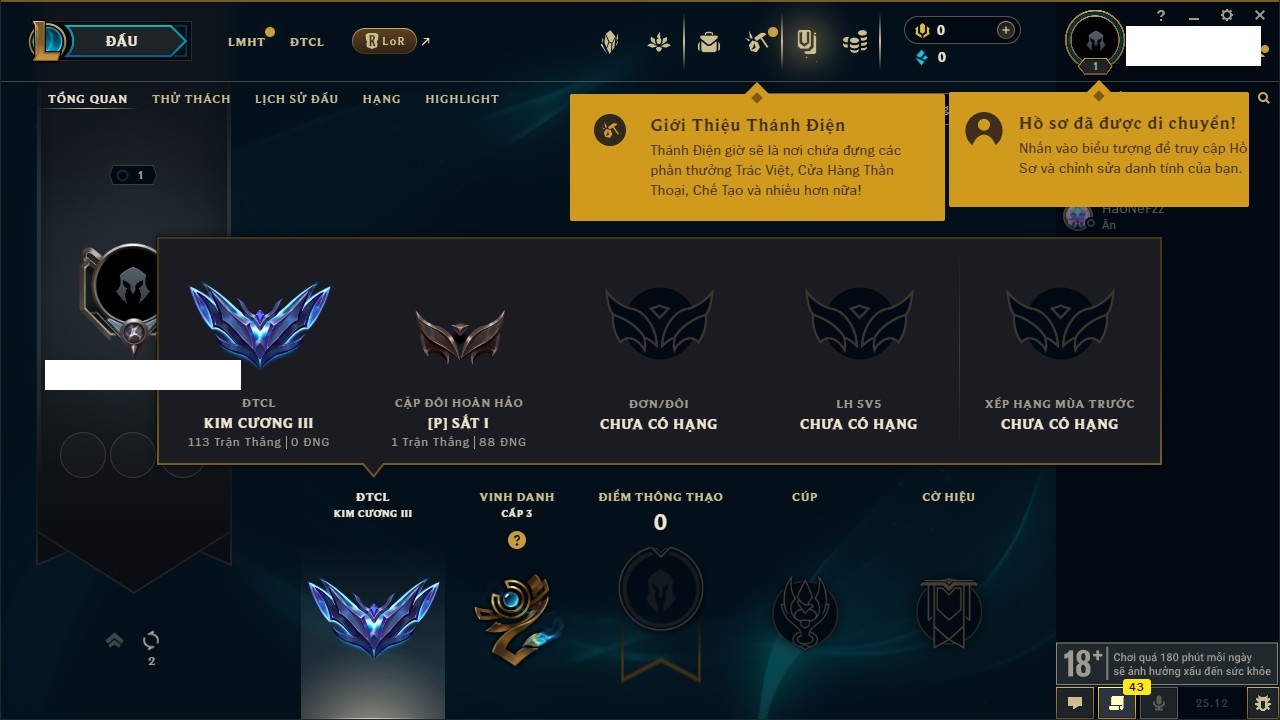 Rank Đơn: Chưa rank mùa nàoKhung: Chưa có khungTướng: 0 - Còn 6300 THXTrang Phục: 0Rank ĐTCL: Bạc IIILinh Thú: 3