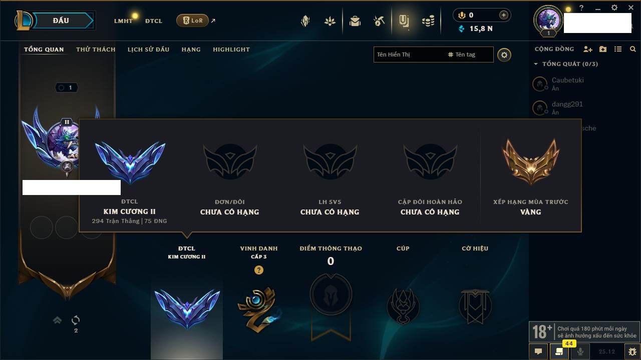 Rank Đơn: Đồng IIKhung: Chưa có khungTướng: 170 - Còn 56487 THXTrang Phục: 90Rank ĐTCL: Chưa RankLinh Thú: 129