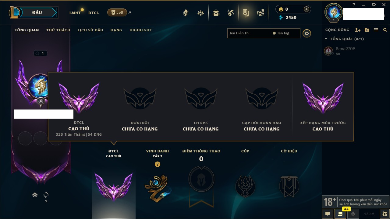 Rank Đơn: Chưa rank mùa nàoKhung: Chưa có khungTướng: 2 - Còn 9000 THXTrang Phục: 0Rank ĐTCL: Bạch Kim IIILinh Thú: 31