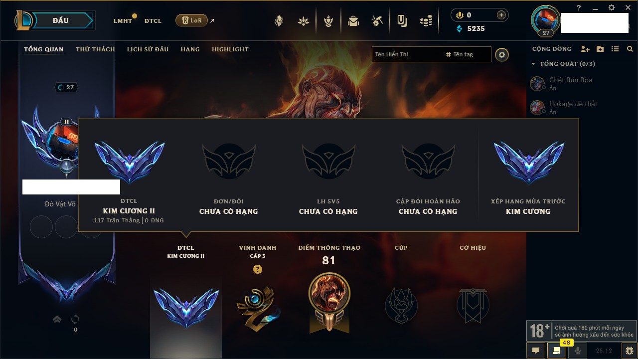 Rank Đơn: Chưa rank mùa nàoKhung: Chưa có khungTướng: 2 - Còn 9000 THXTrang Phục: 0Rank ĐTCL: Bạch Kim IIILinh Thú: 31