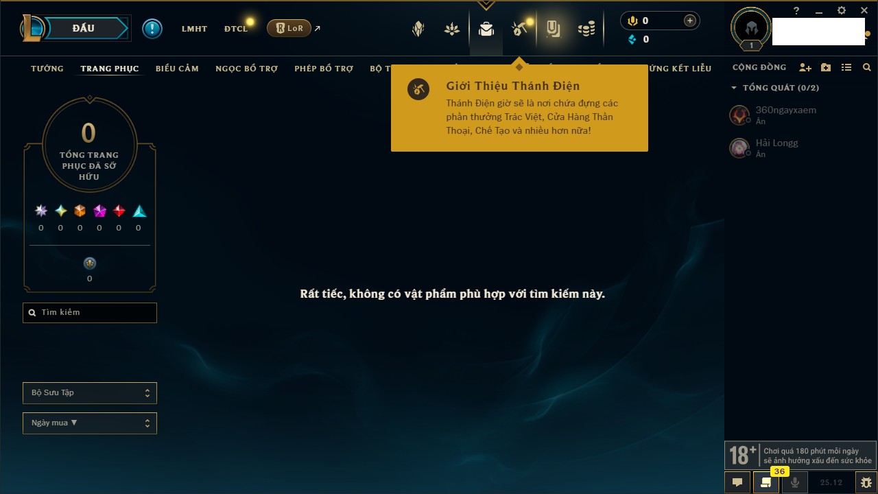 Rank Đơn: Chưa RankKhung: Chưa có khungTướng: 169 - Còn 43188 THXTrang Phục: 205Rank ĐTCL: Chưa RankLinh Thú: 259