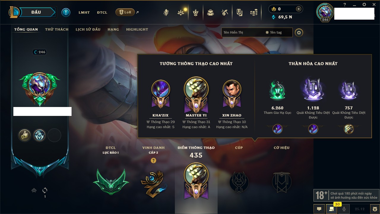 Rank Đơn: Bạch Kim IIKhung: Bạch kimTướng: 171 - Còn 316137 THXTrang Phục: 89Rank ĐTCL: Bạch Kim IIILinh Thú: 94