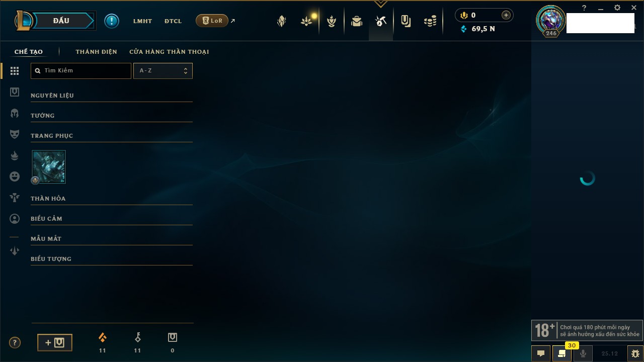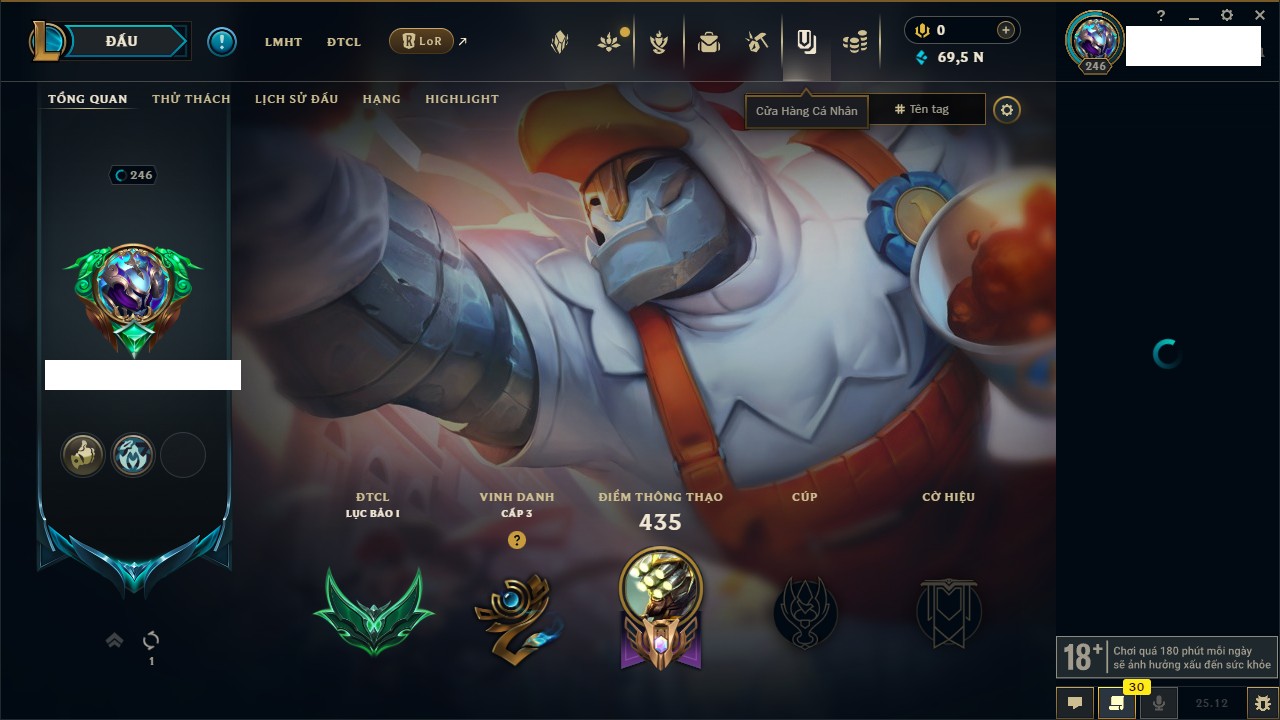 Rank Đơn: Lục Bảo IVKhung: VàngTướng: 171 - Còn 154648 THXTrang Phục: 203Rank ĐTCL: Bạch Kim IVLinh Thú: 69