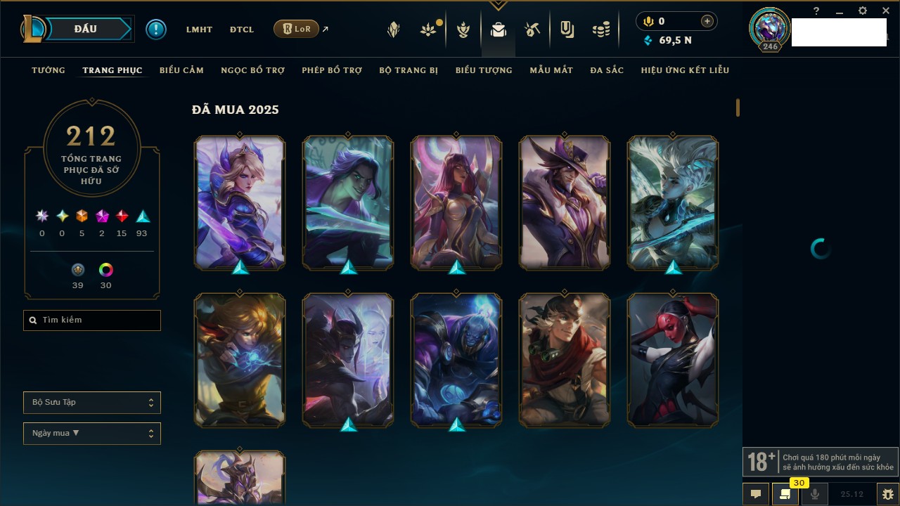 Rank Đơn: Vàng IIKhung: VàngTướng: 170 - Còn 243330 THXTrang Phục: 230Rank ĐTCL: Chưa RankLinh Thú: 68