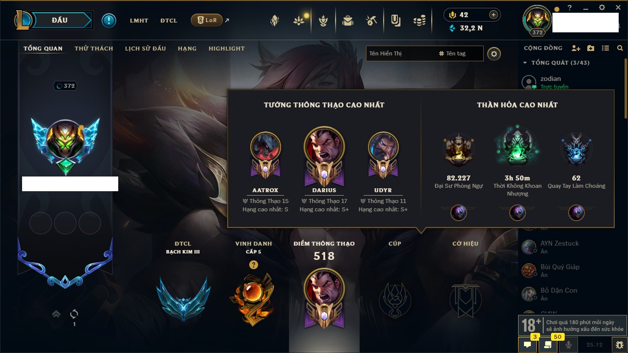 Rank Đơn: Vàng IKhung: Bạch kimTướng: 170 - Còn 212450 THXTrang Phục: 214Rank ĐTCL: Bạch Kim IVLinh Thú: 221