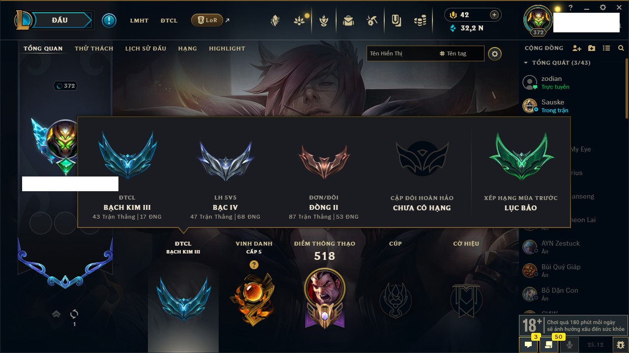 Rank Đơn: Bạch Kim IVKhung: Bạch kimTướng: 171 - Còn 182788 THXTrang Phục: 158Rank ĐTCL: Lục Bảo IVLinh Thú: 56