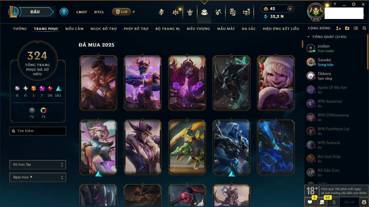Rank Đơn: Vàng IVKhung: VàngTướng: 172 - Còn 2742 THXTrang Phục: 367Rank ĐTCL: Chưa RankLinh Thú: 214