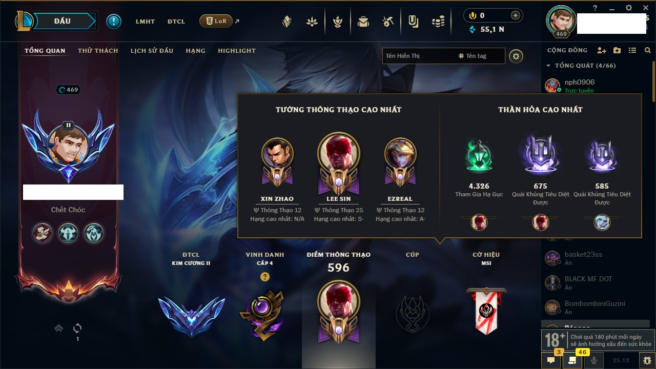 Rank Đơn: Bạch Kim IIIKhung: Bạch kimTướng: 170 - Còn 61079 THXTrang Phục: 352Rank ĐTCL: Sắt IILinh Thú: 70
