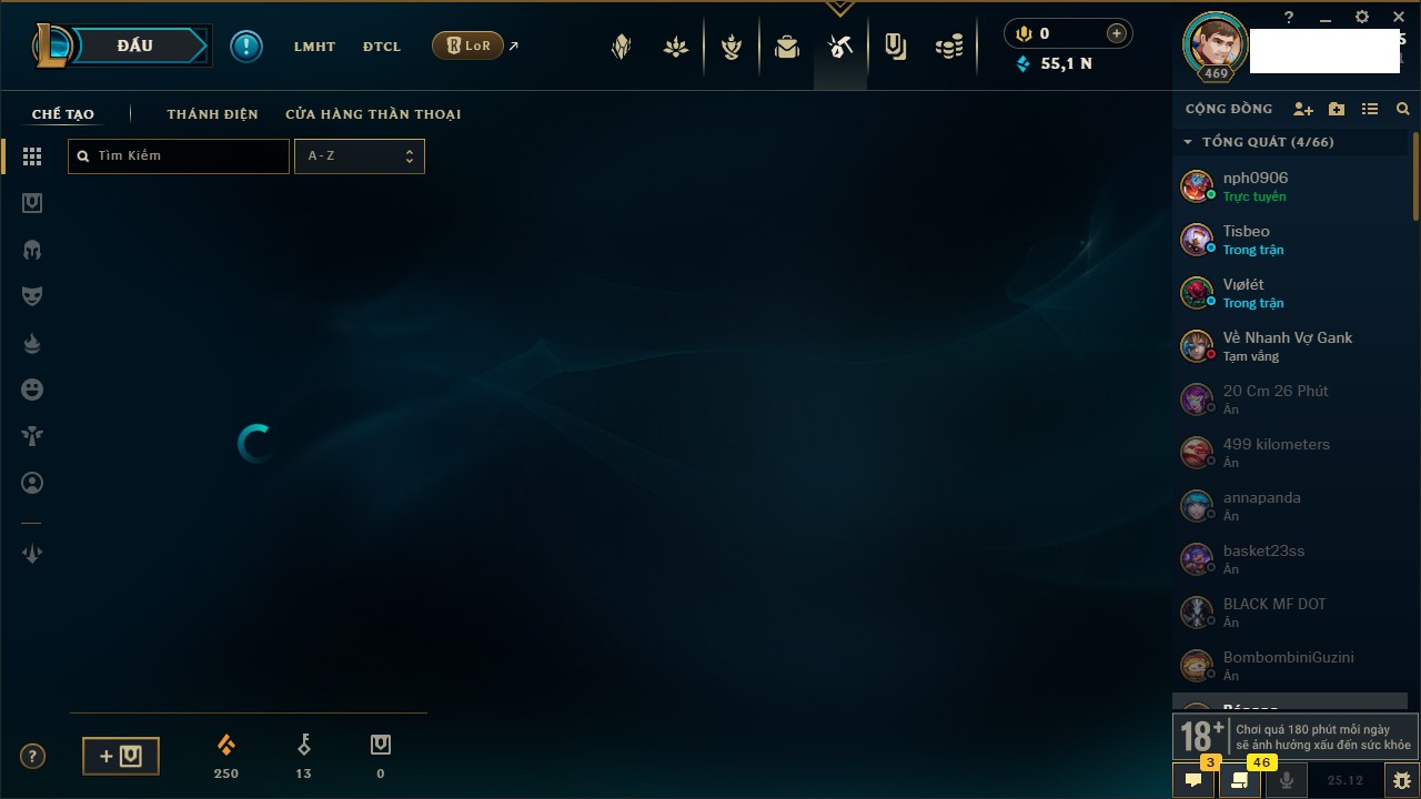 Rank Đơn: Bạch Kim IIKhung: Bạch kimTướng: 171 - Còn 263986 THXTrang Phục: 306Rank ĐTCL: Lục Bảo IVLinh Thú: 96