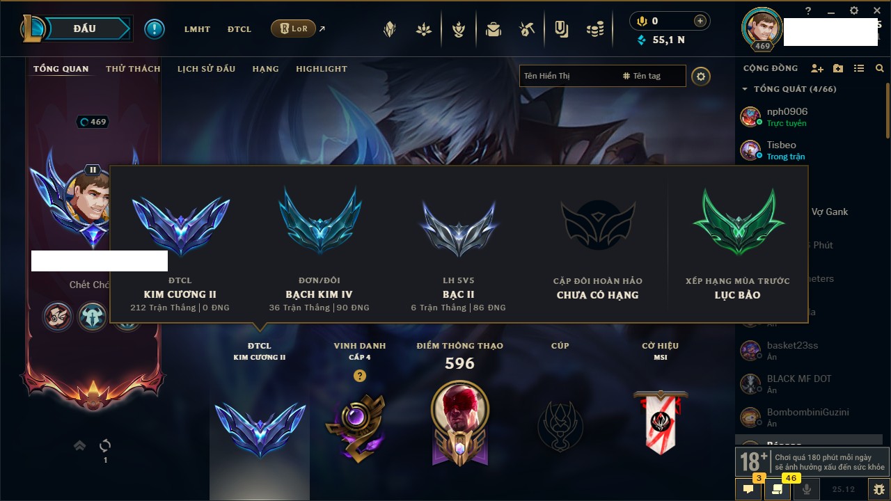 Rank Đơn: Bạch Kim IVKhung: Bạch kimTướng: 171 - Còn 182788 THXTrang Phục: 158Rank ĐTCL: Lục Bảo IVLinh Thú: 56