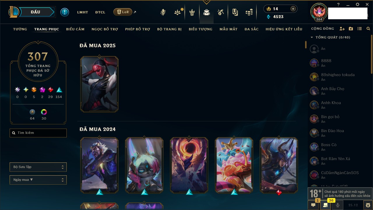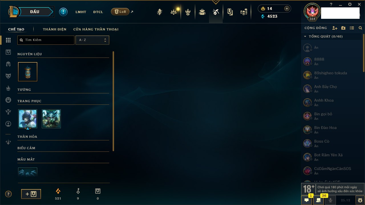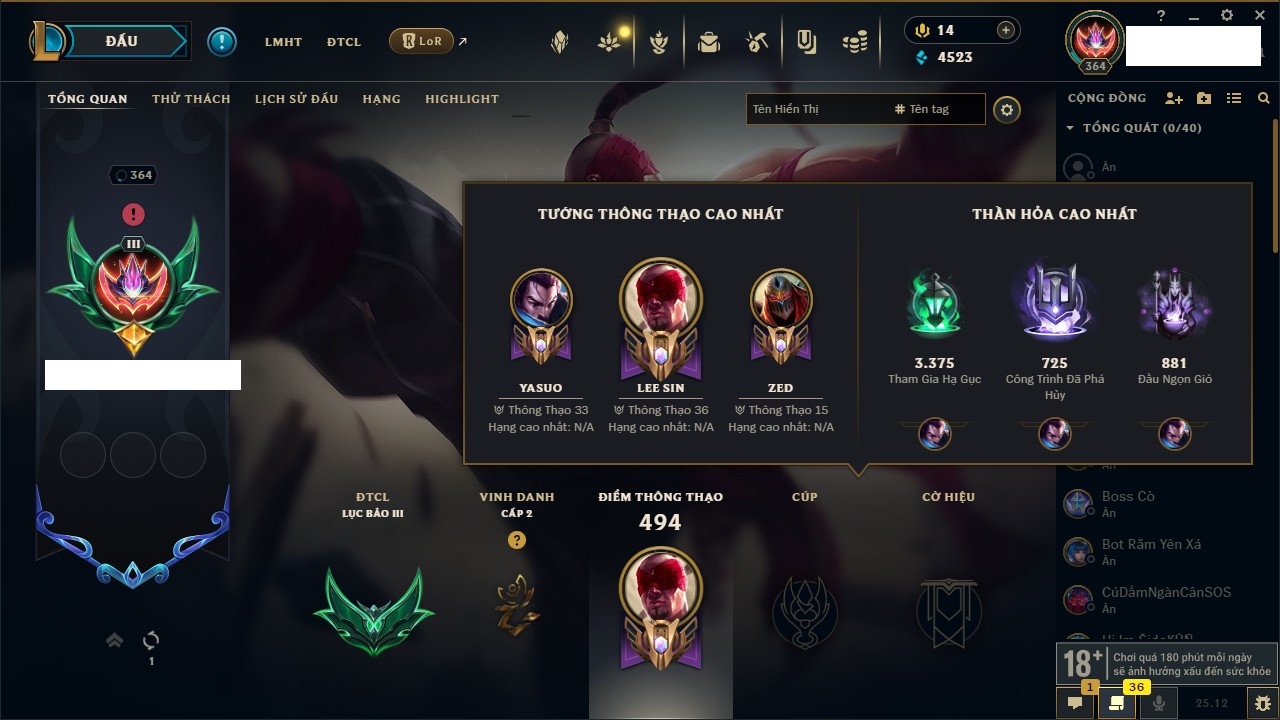 Rank Đơn: Vàng IIKhung: VàngTướng: 171 - Còn 219803 THXTrang Phục: 254Rank ĐTCL: Chưa RankLinh Thú: 78