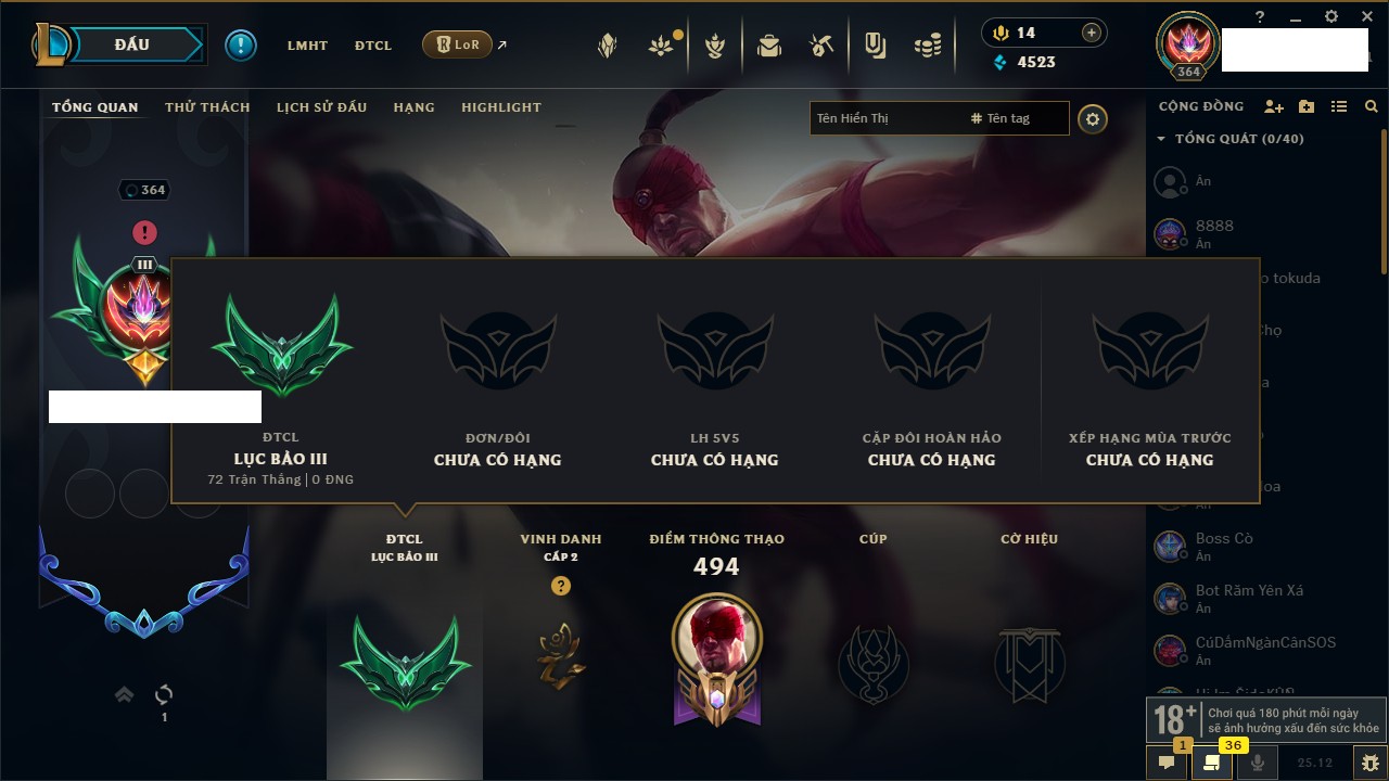 Rank Đơn: Bạc IVKhung: BạcTướng: 171 - Còn 173918 THXTrang Phục: 233Rank ĐTCL: Lục Bảo IIILinh Thú: 26