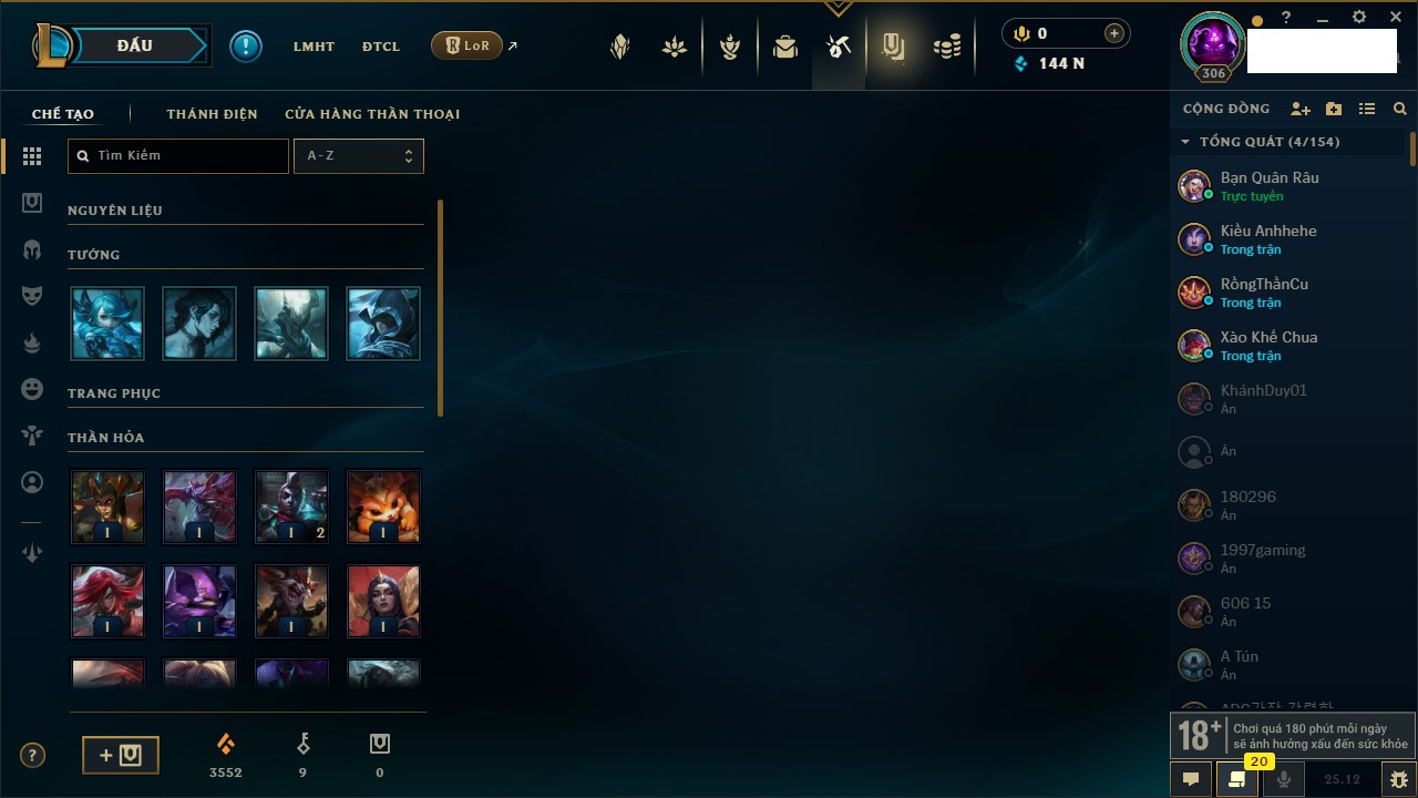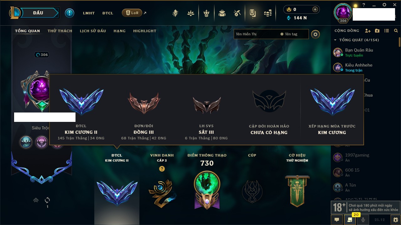 Rank Đơn: Vàng IIIKhung: BạcTướng: 171 - Còn 101359 THXTrang Phục: 88Rank ĐTCL: Kim Cương IVLinh Thú: 200