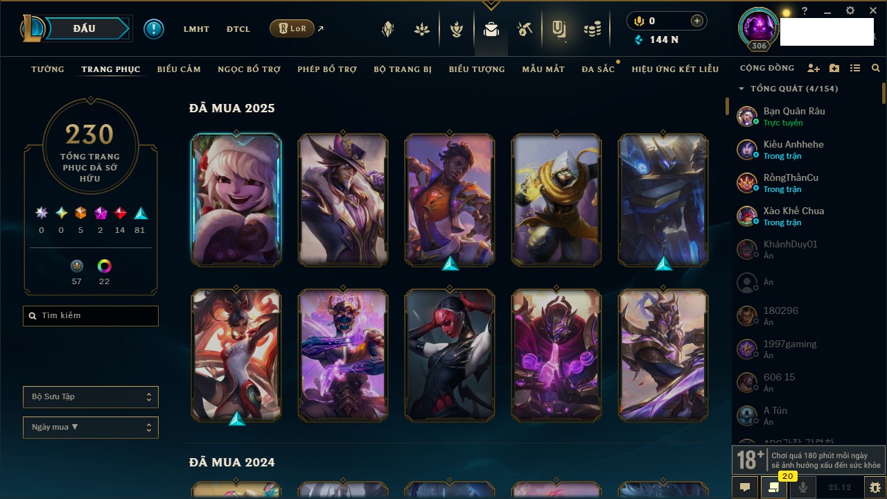 Rank Đơn: Vàng IVKhung: VàngTướng: 171 - Còn 56632 THXTrang Phục: 215Rank ĐTCL: Bạc ILinh Thú: 71