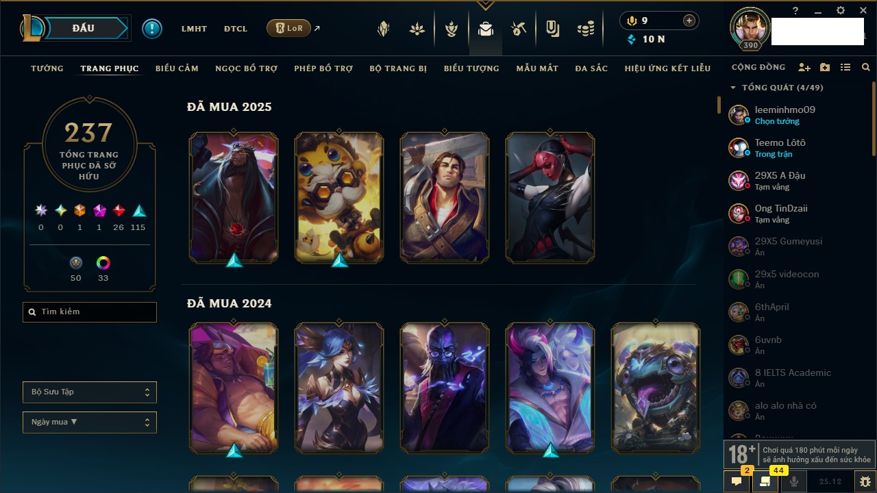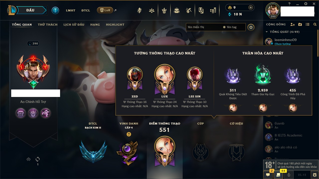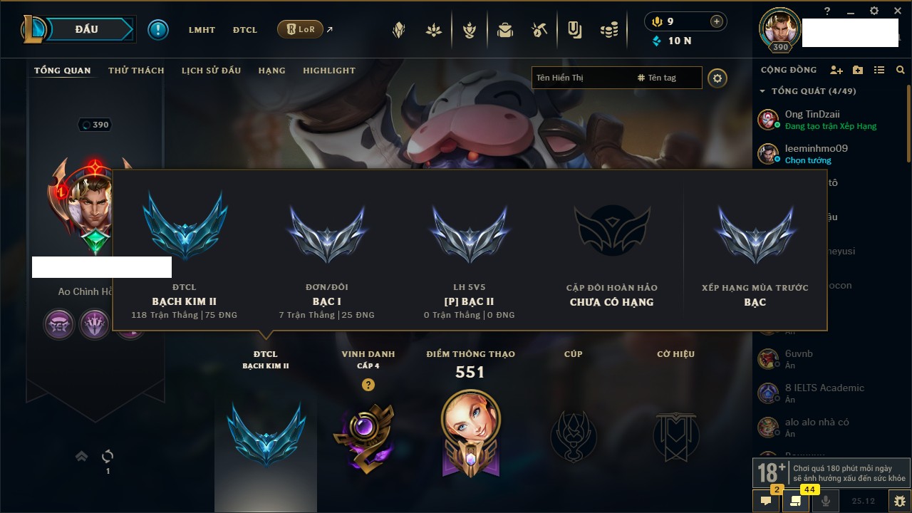 Rank Đơn: Lục Bảo IVKhung: Bạch kimTướng: 171 - Còn 128452 THXTrang Phục: 193Rank ĐTCL: Bạc IIILinh Thú: 100