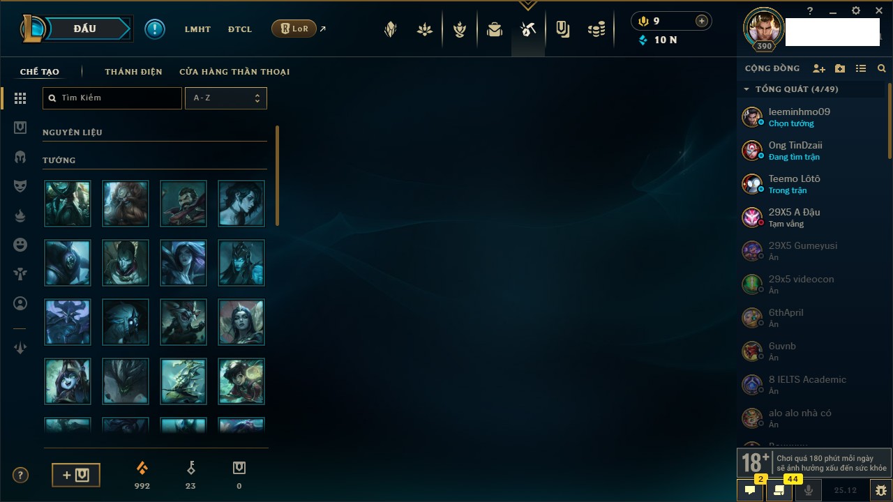 Rank Đơn: Vàng IIIKhung: BạcTướng: 171 - Còn 101359 THXTrang Phục: 88Rank ĐTCL: Kim Cương IVLinh Thú: 200