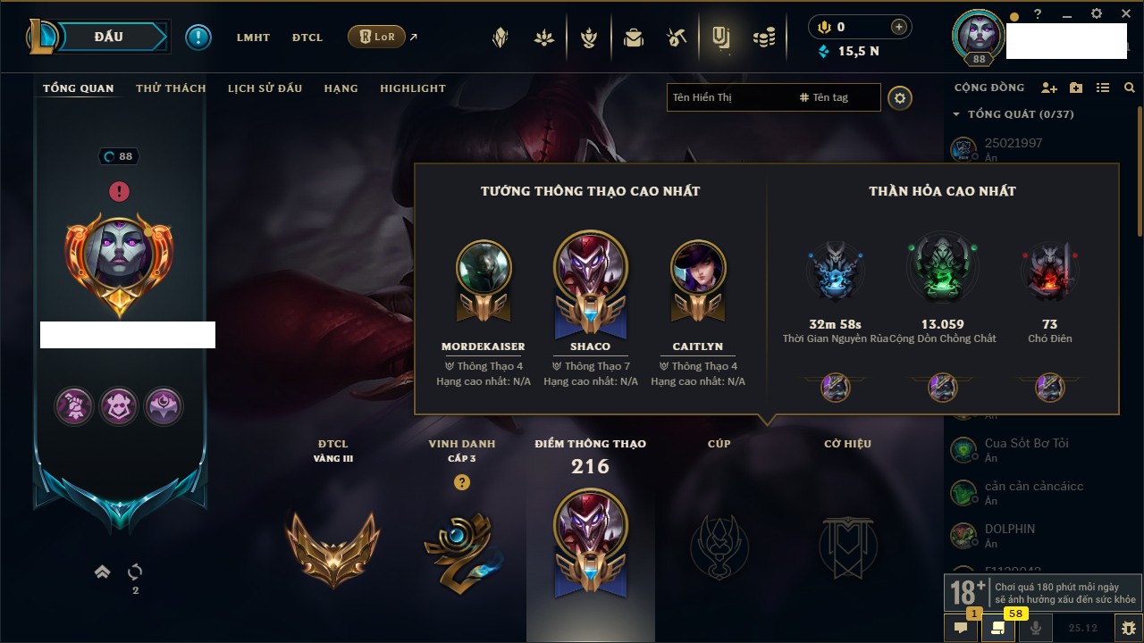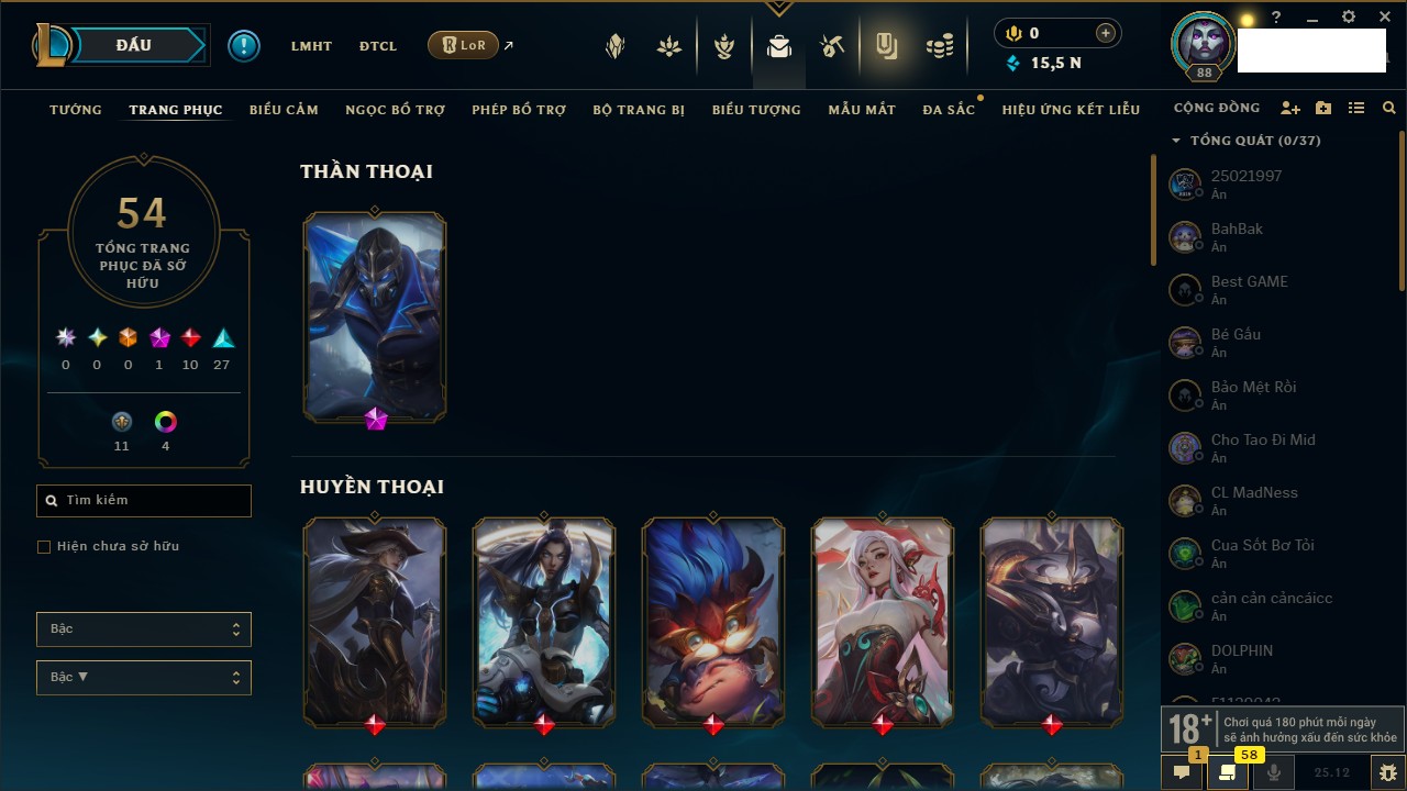 Rank Đơn: Đồng IVKhung: Chưa có khungTướng: 140 - Còn 10800 THXTrang Phục: 19Rank ĐTCL: Chưa RankLinh Thú: 119
