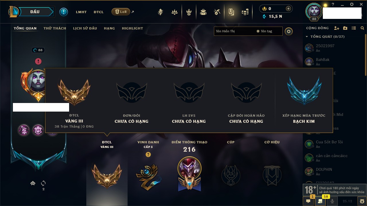 Rank Đơn: Vàng IIKhung: Chưa có khungTướng: 83 - Còn 8062 THXTrang Phục: 61Rank ĐTCL: Chưa RankLinh Thú: 26