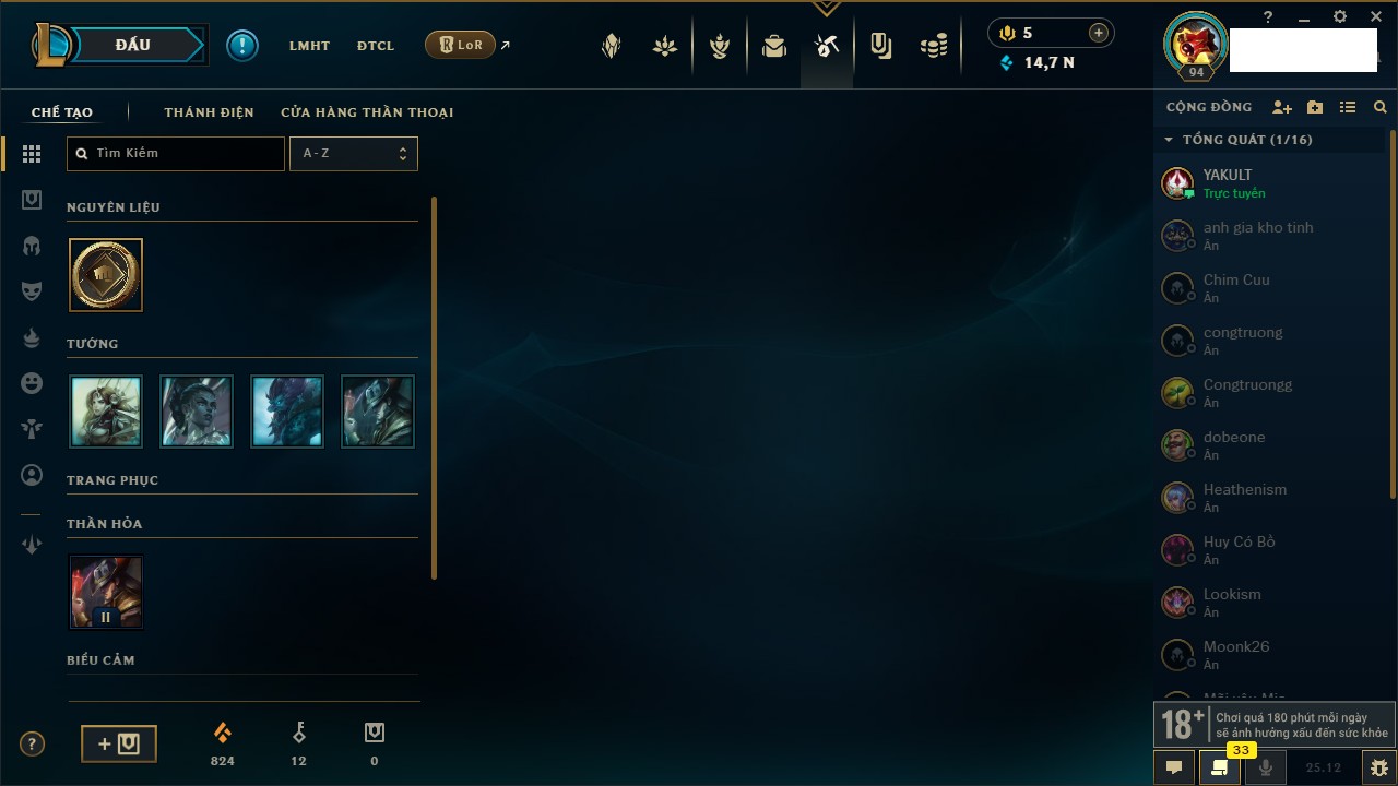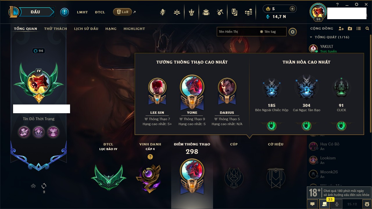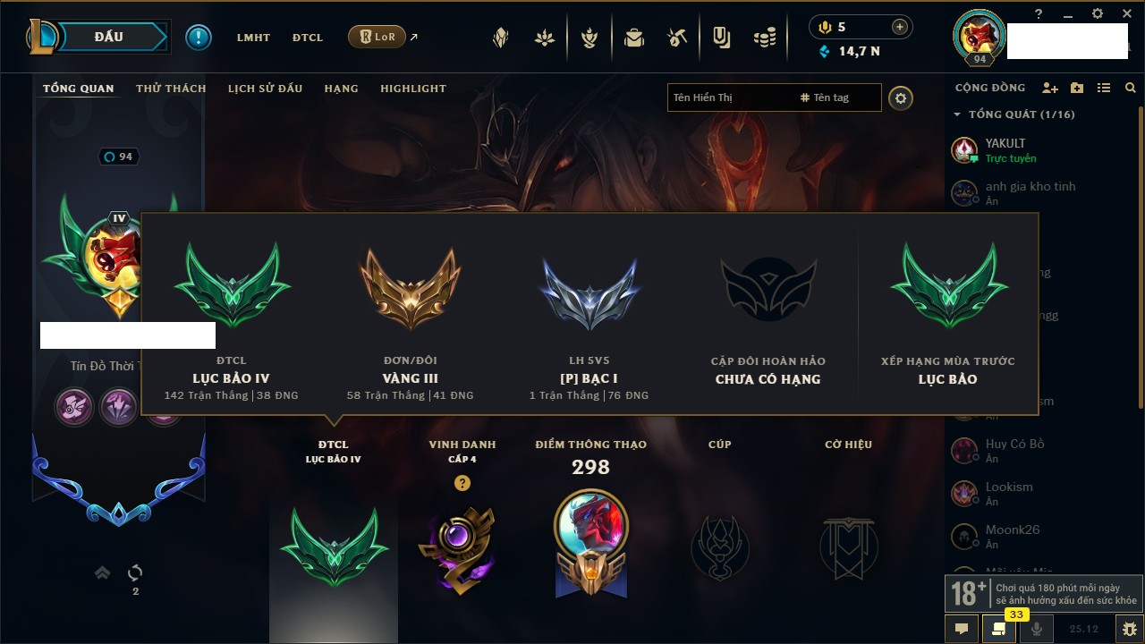 Rank Đơn: Bạch Kim IVKhung: Bạch kimTướng: 171 - Còn 154285 THXTrang Phục: 169Rank ĐTCL: Bạch Kim IILinh Thú: 60
