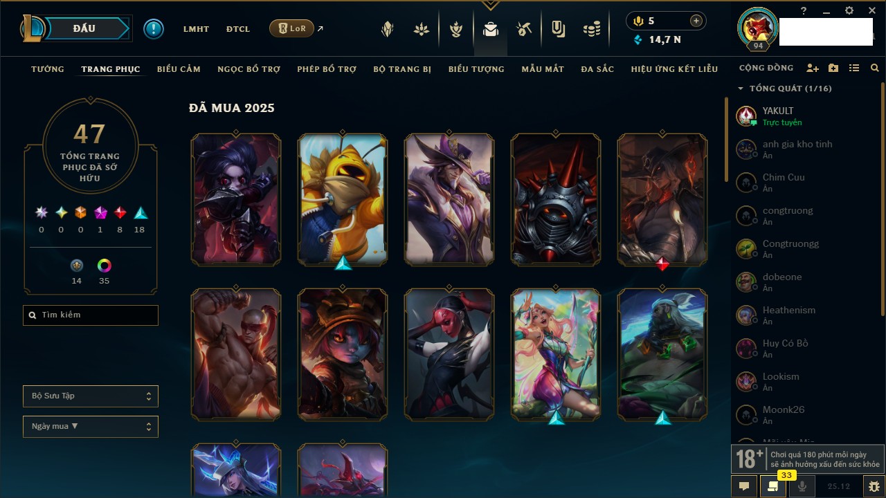 Rank Đơn: Vàng IVKhung: VàngTướng: 171 - Còn 48721 THXTrang Phục: 171Rank ĐTCL: Chưa RankLinh Thú: 27