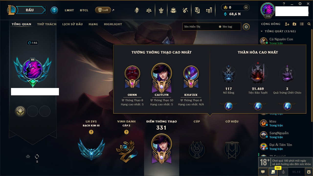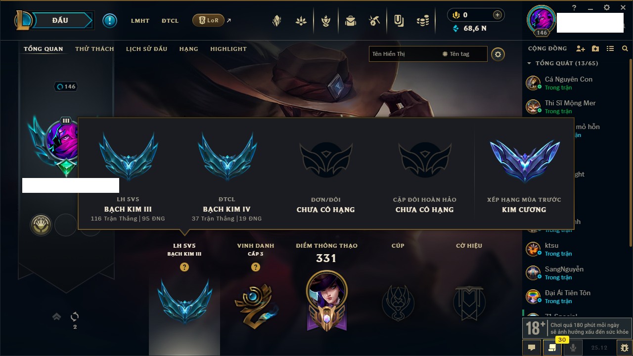 Rank Đơn: Chưa RankKhung: Bạch kimTướng: 172 - Còn 179290 THXTrang Phục: 187Rank ĐTCL: Chưa RankLinh Thú: 49