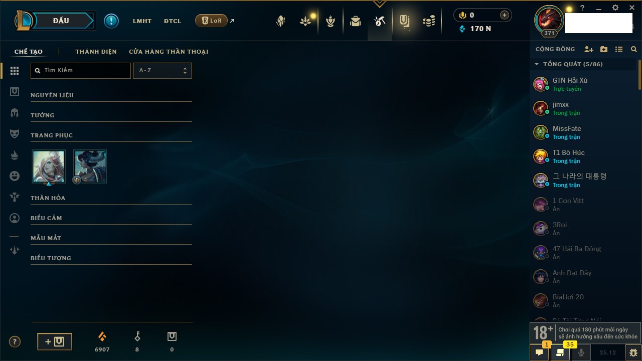 Rank Đơn: Bạc IVKhung: BạcTướng: 171 - Còn 161685 THXTrang Phục: 139Rank ĐTCL: Đồng ILinh Thú: 51