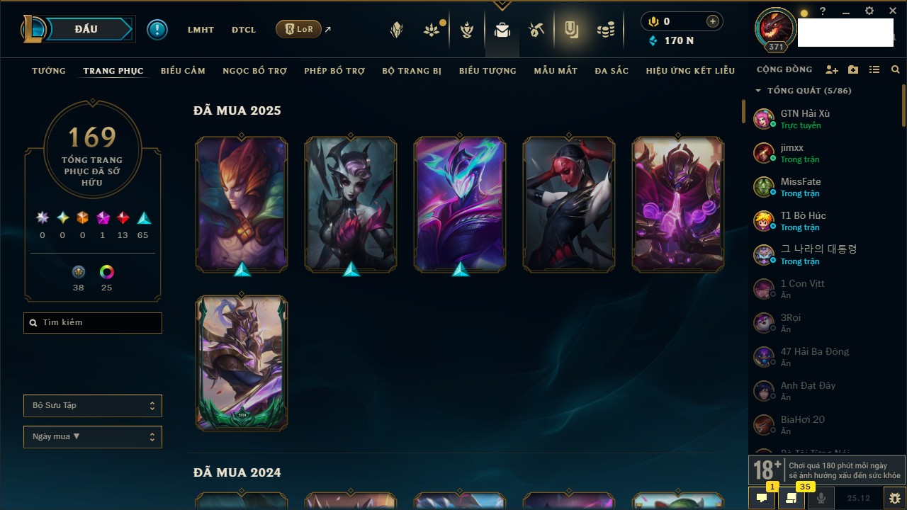 Rank Đơn: Đồng IIIKhung: Chưa có khungTướng: 152 - Còn 6423 THXTrang Phục: 160Rank ĐTCL: Chưa RankLinh Thú: 107