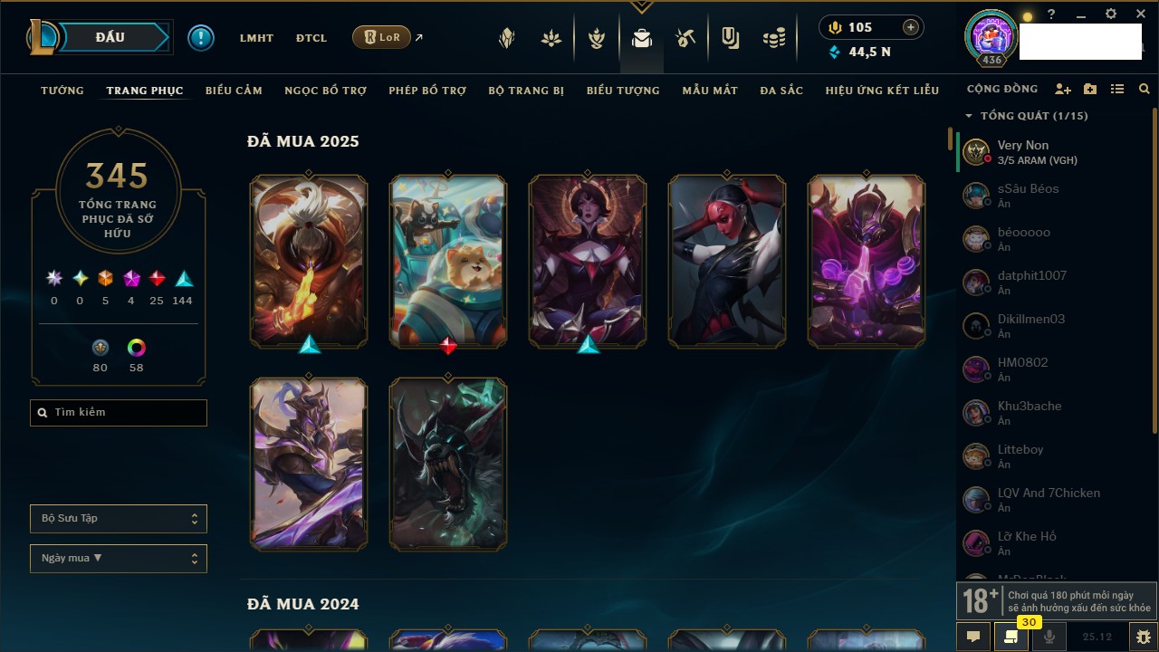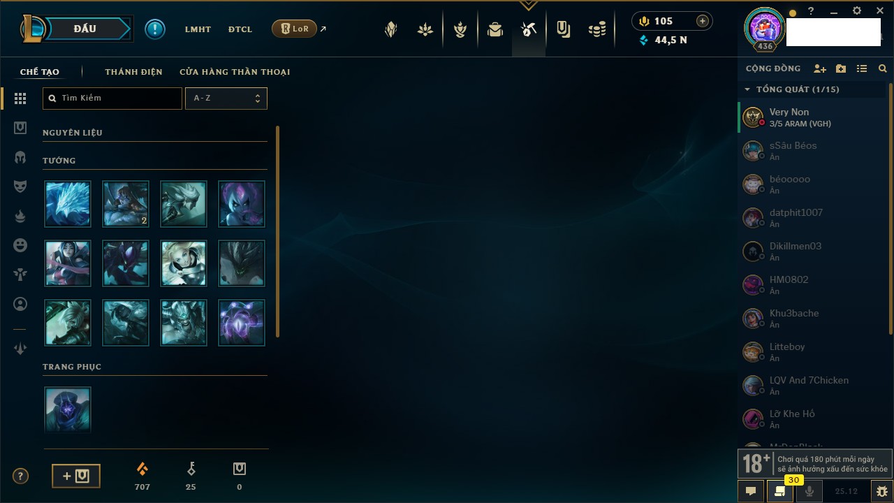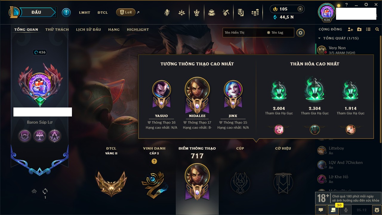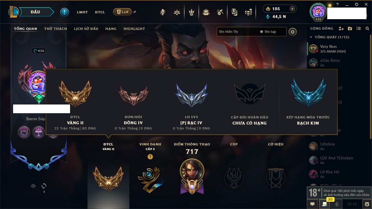 Rank Đơn: Vàng IKhung: Bạch kimTướng: 170 - Còn 212450 THXTrang Phục: 214Rank ĐTCL: Bạch Kim IVLinh Thú: 221