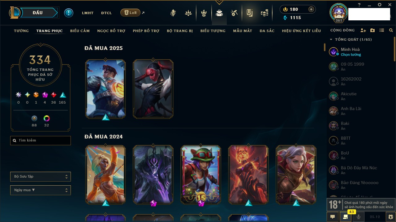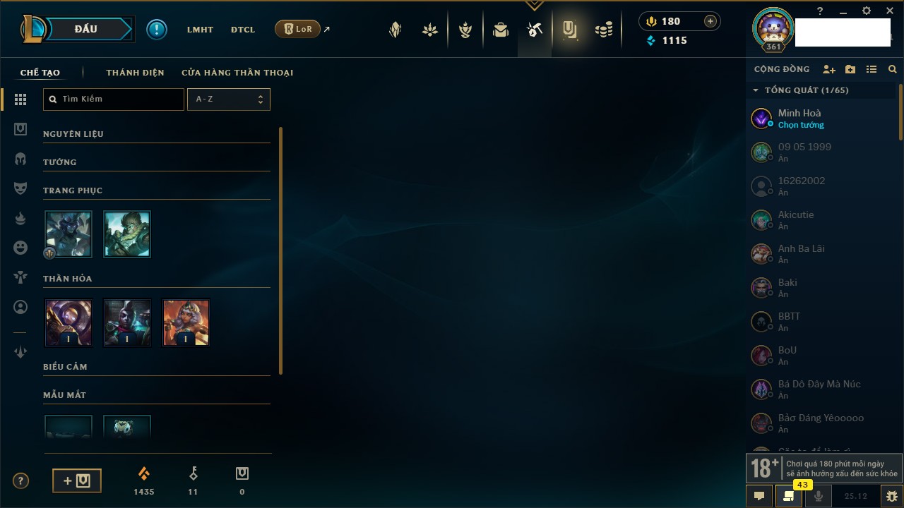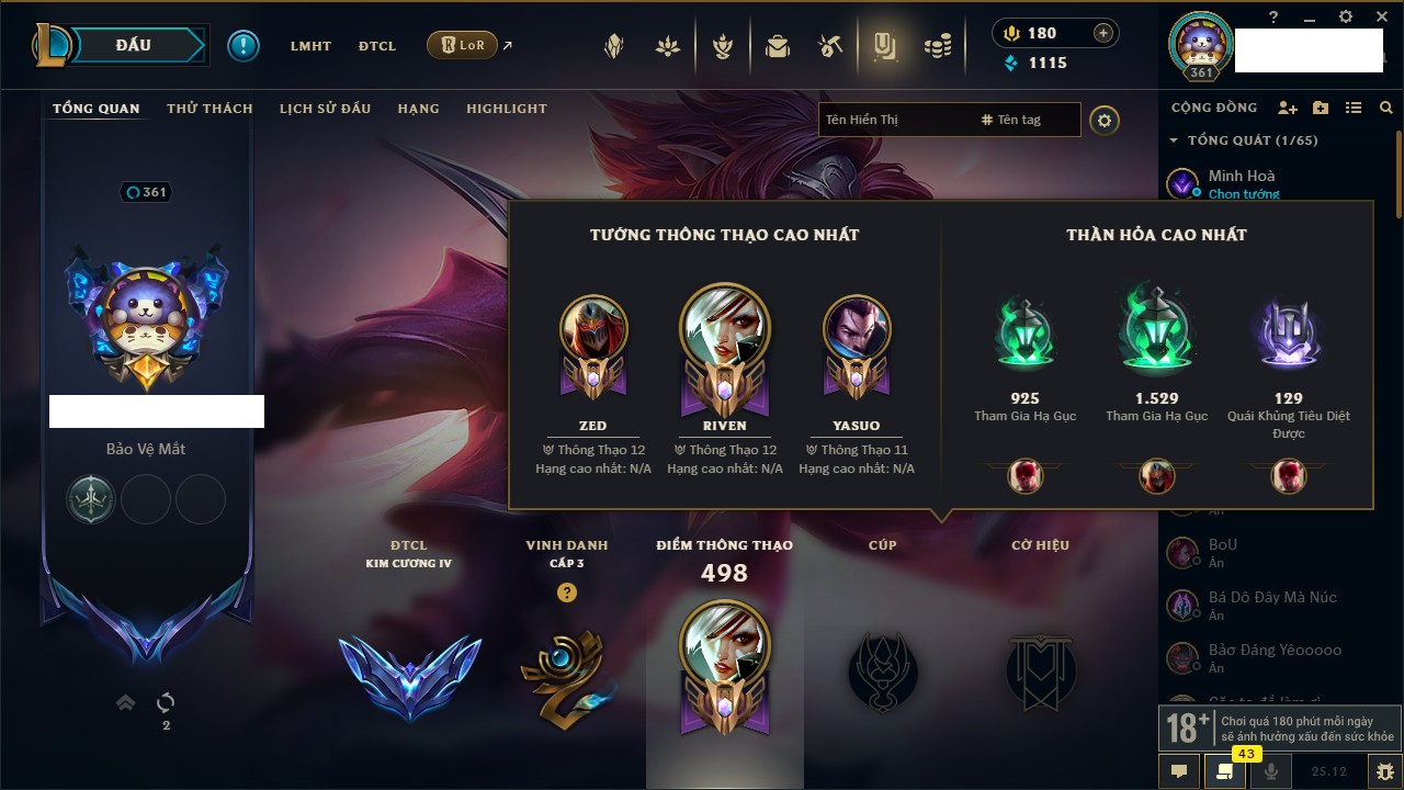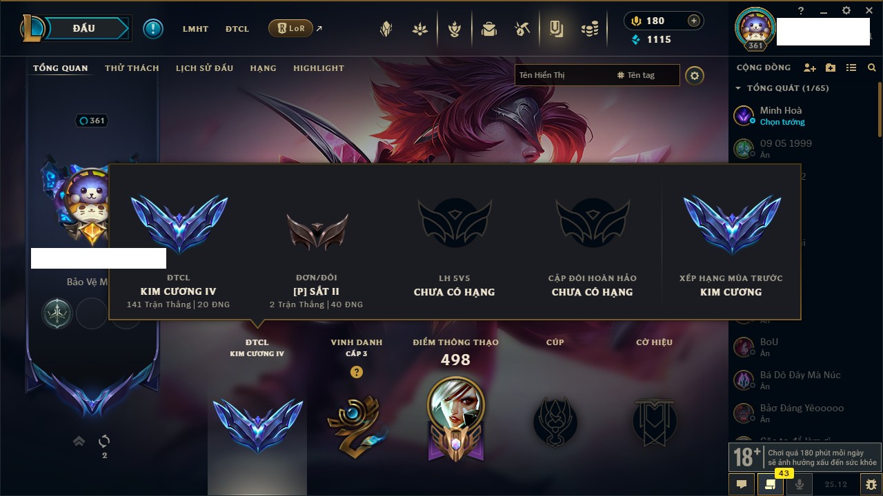 Rank Đơn: Bạc IIKhung: Bạch kimTướng: 169 - Còn 81813 THXTrang Phục: 301Rank ĐTCL: Chưa RankLinh Thú: 140