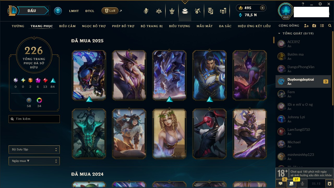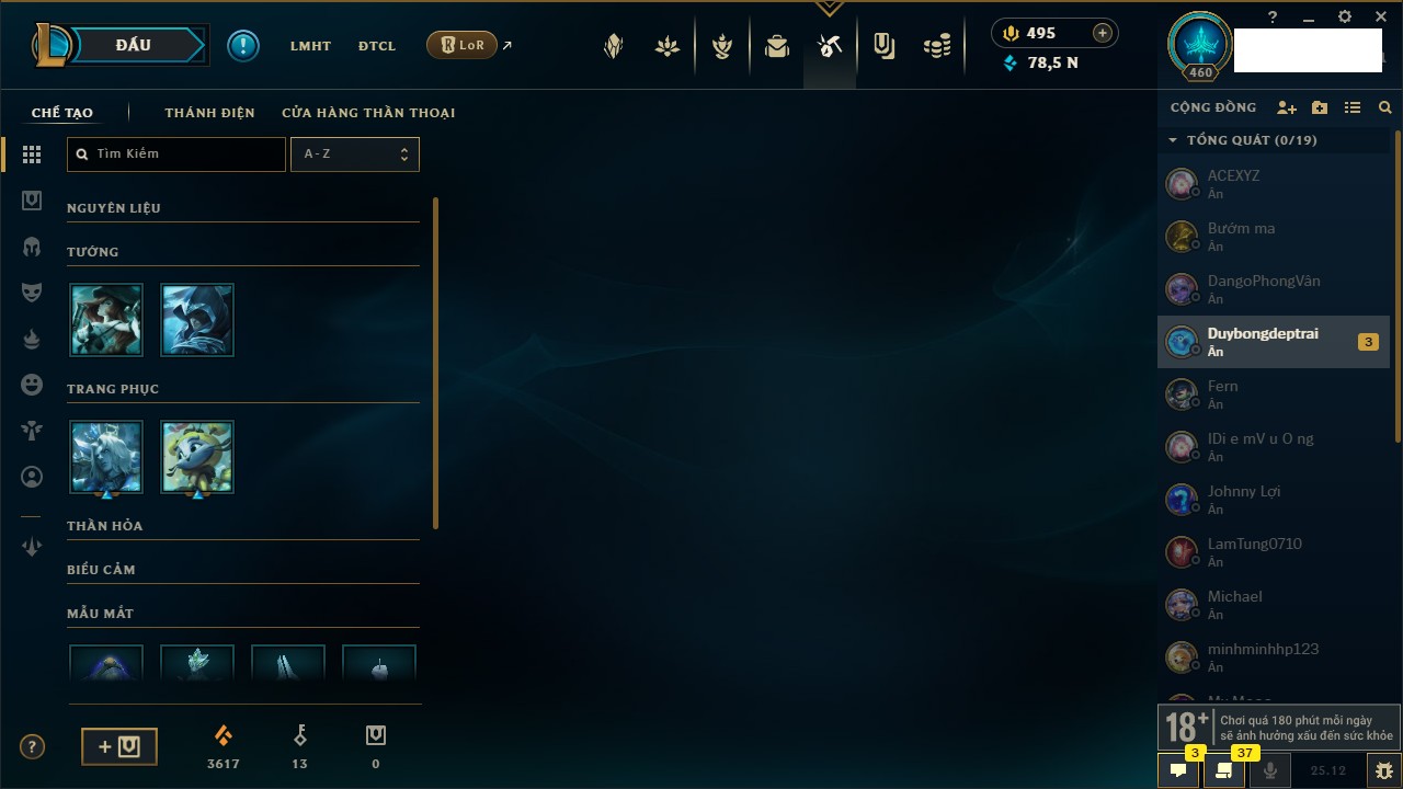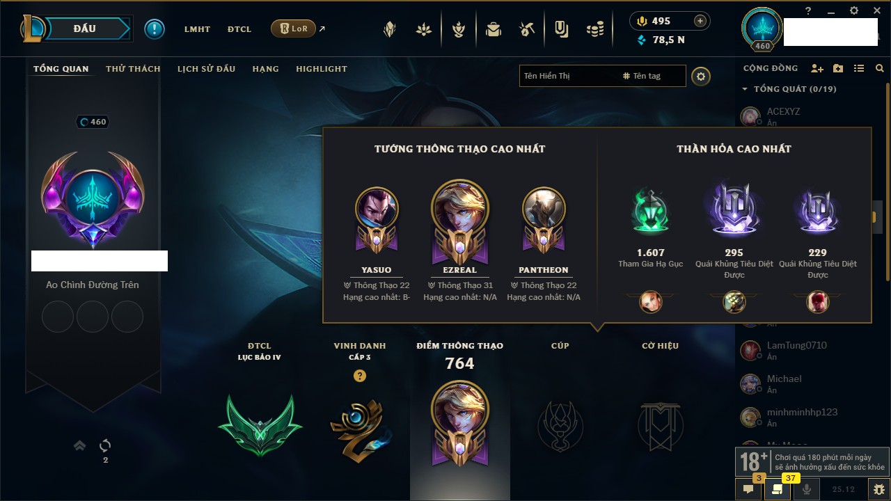 Rank Đơn: Chưa RankKhung: Bạch kimTướng: 172 - Còn 867 THXTrang Phục: 242Rank ĐTCL: Chưa RankLinh Thú: 162
