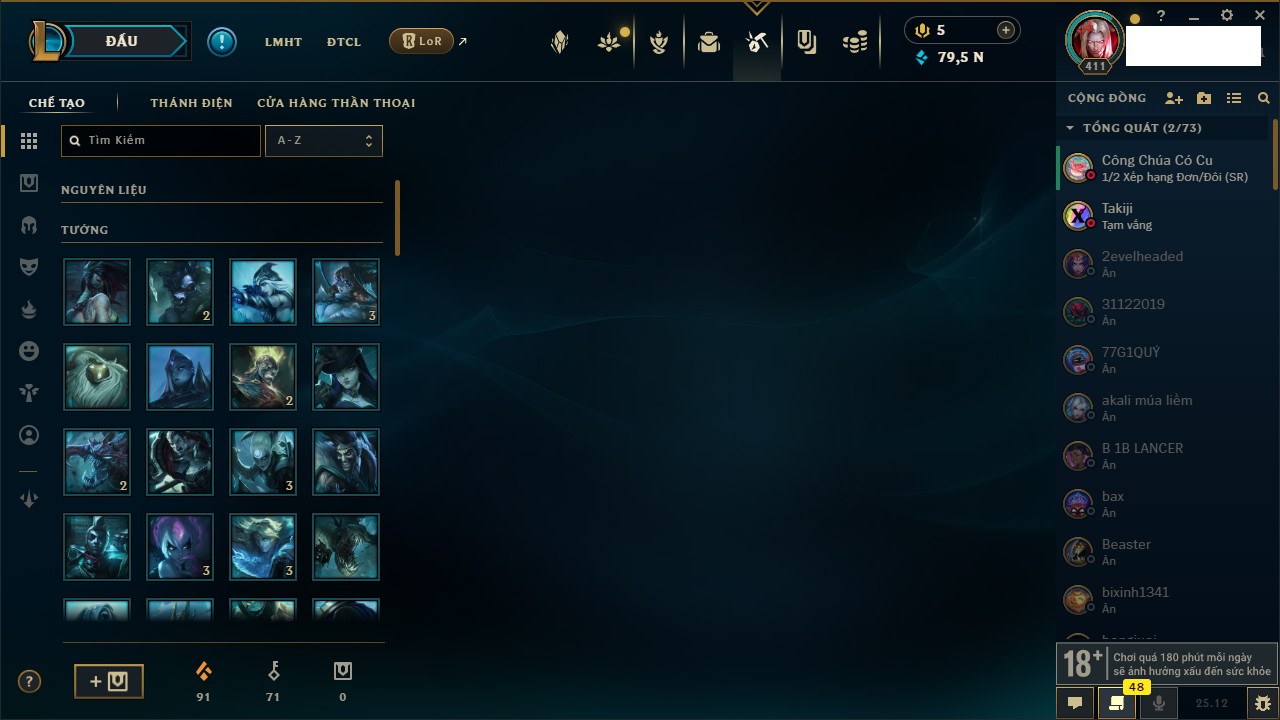 Rank Đơn: Bạc IIIKhung: BạcTướng: 171 - Còn 308470 THXTrang Phục: 164Rank ĐTCL: Chưa RankLinh Thú: 51