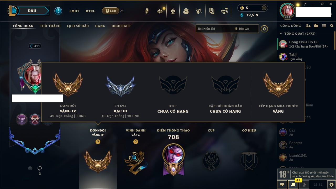 Rank Đơn: Bạc IIKhung: VàngTướng: 171 - Còn 70460 THXTrang Phục: 169Rank ĐTCL: Vàng ILinh Thú: 46
