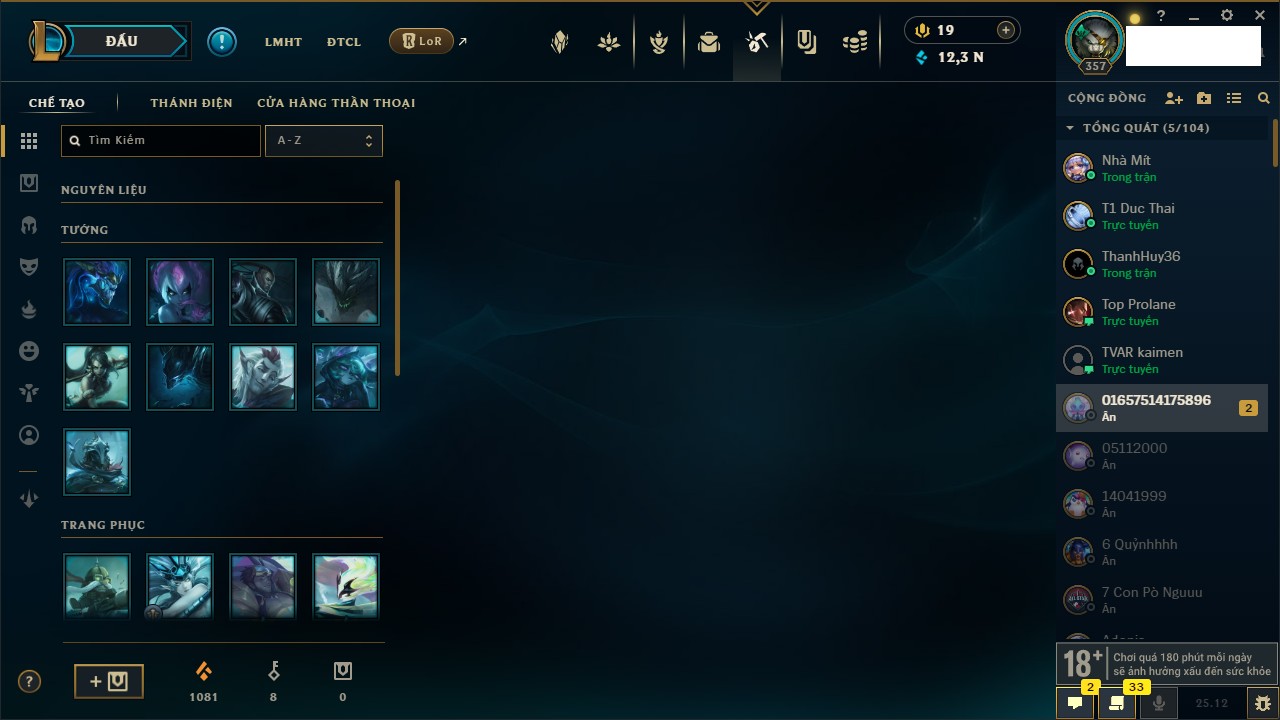 Rank Đơn: Vàng IV Khung: Vàng Tướng: 170 - Còn 38668 THX Trang Phục: 120 Rank ĐTCL: Chưa Rank Linh Thú: 91