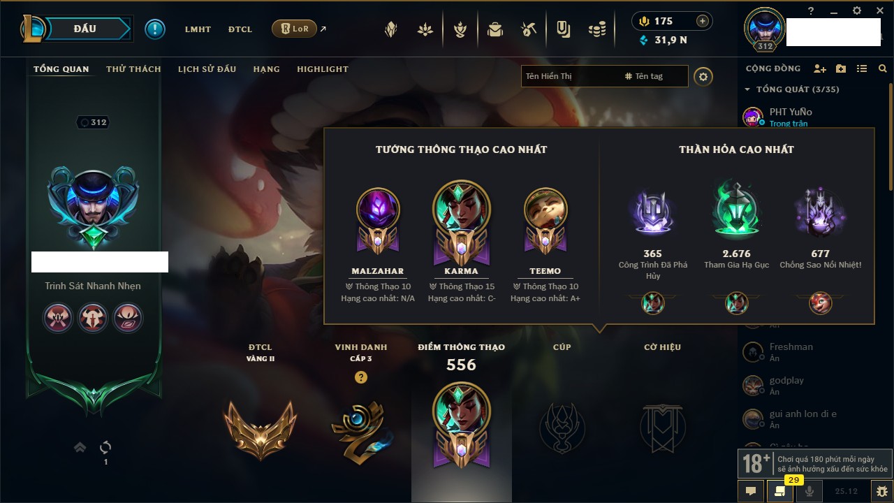 Rank Đơn: Bạch Kim IVKhung: Bạch kimTướng: 171 - Còn 154285 THXTrang Phục: 169Rank ĐTCL: Bạch Kim IILinh Thú: 60