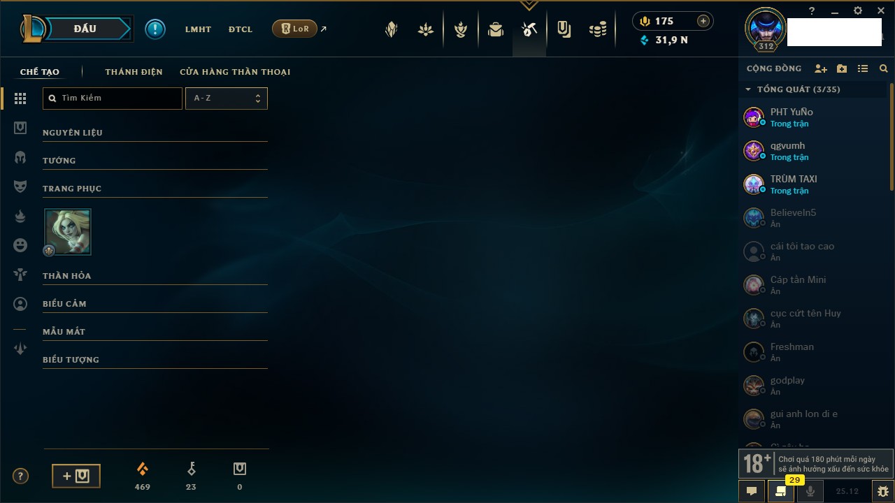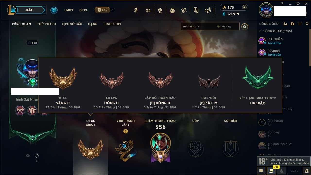 Rank Đơn: Vàng IVKhung: BạcTướng: 166 - Còn 180925 THXTrang Phục: 163Rank ĐTCL: Chưa RankLinh Thú: 67