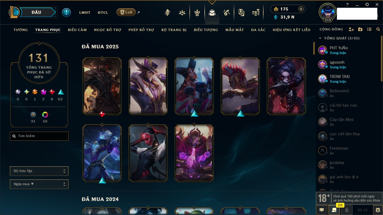 Rank Đơn: Vàng IVKhung: VàngTướng: 171 - Còn 48721 THXTrang Phục: 171Rank ĐTCL: Chưa RankLinh Thú: 27