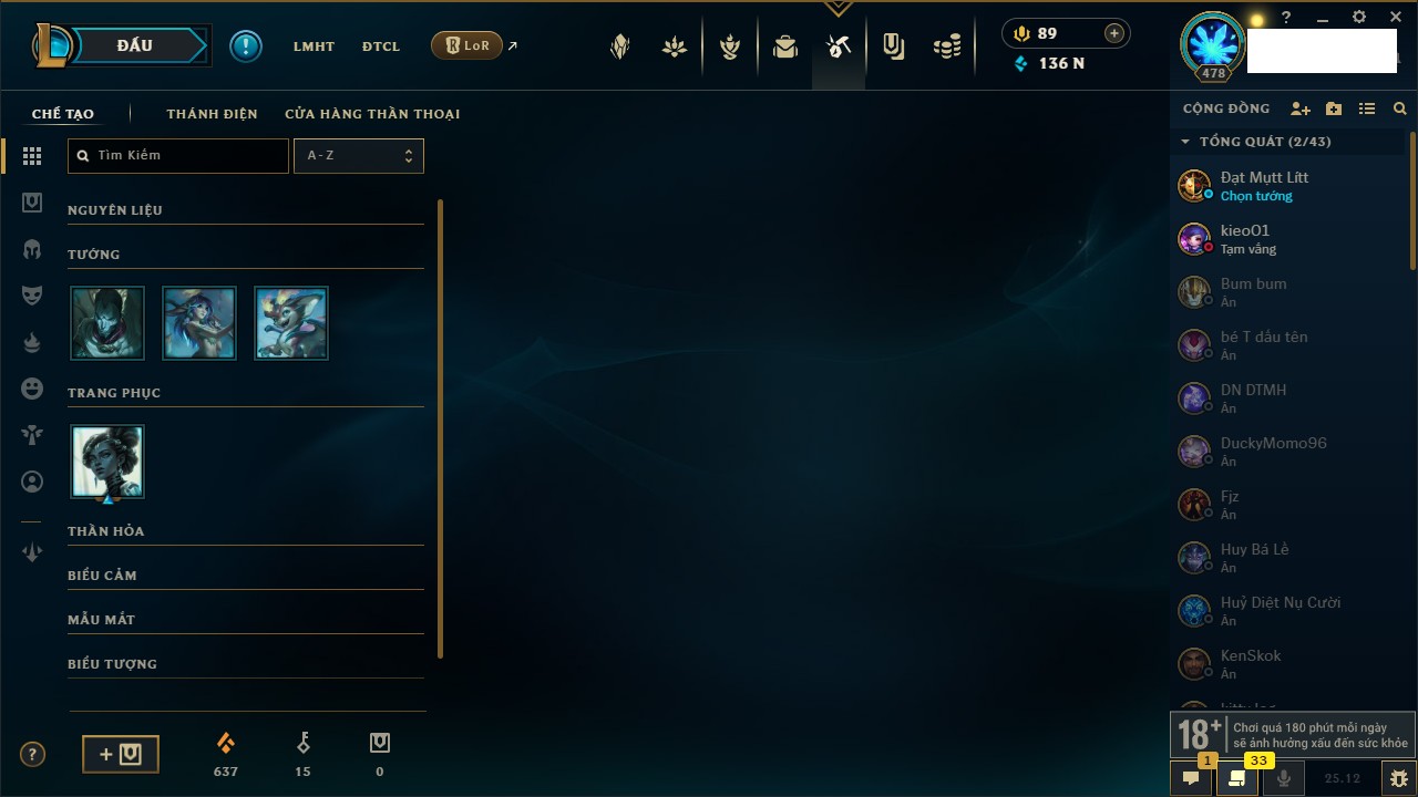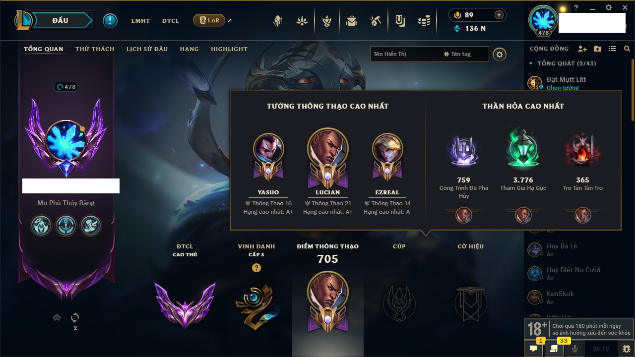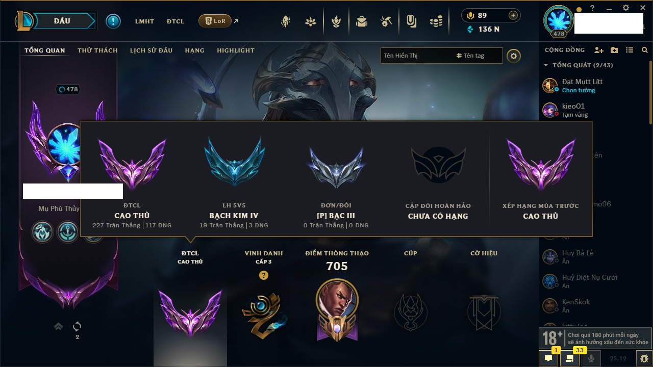 Rank Đơn: Bạc IIIKhung: BạcTướng: 171 - Còn 51045 THXTrang Phục: 220Rank ĐTCL: Sắt IILinh Thú: 141