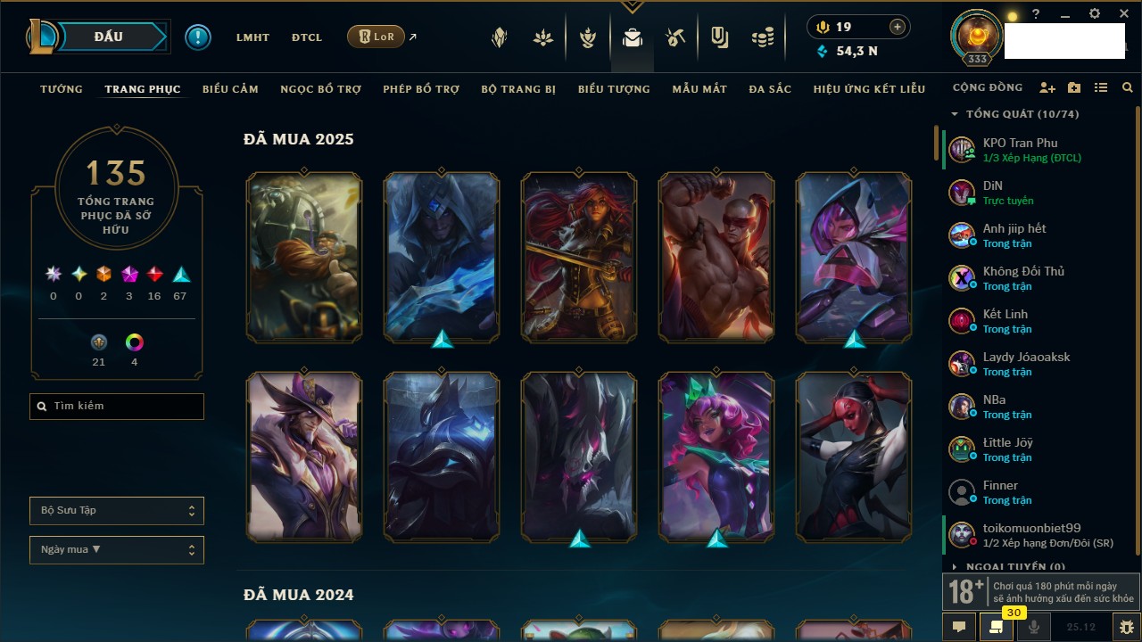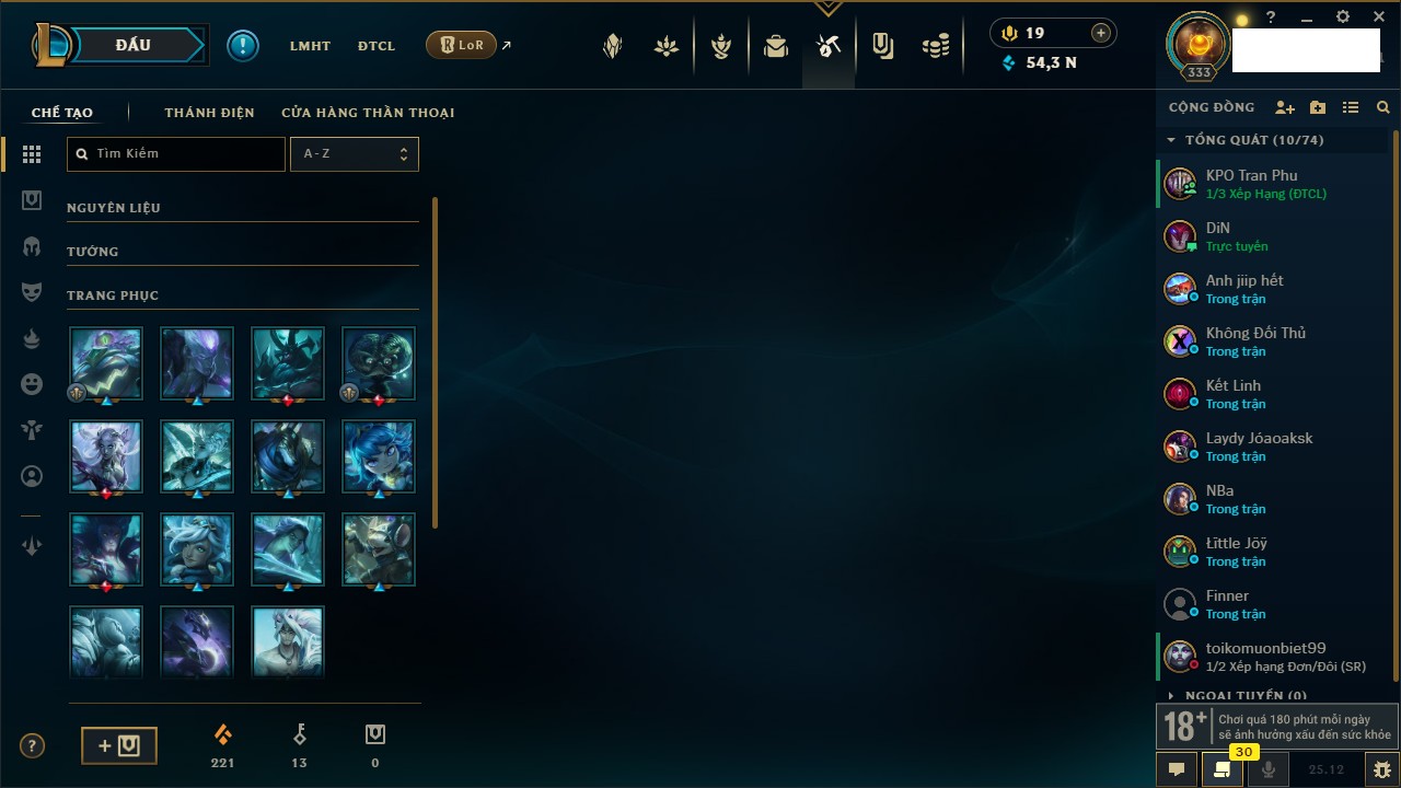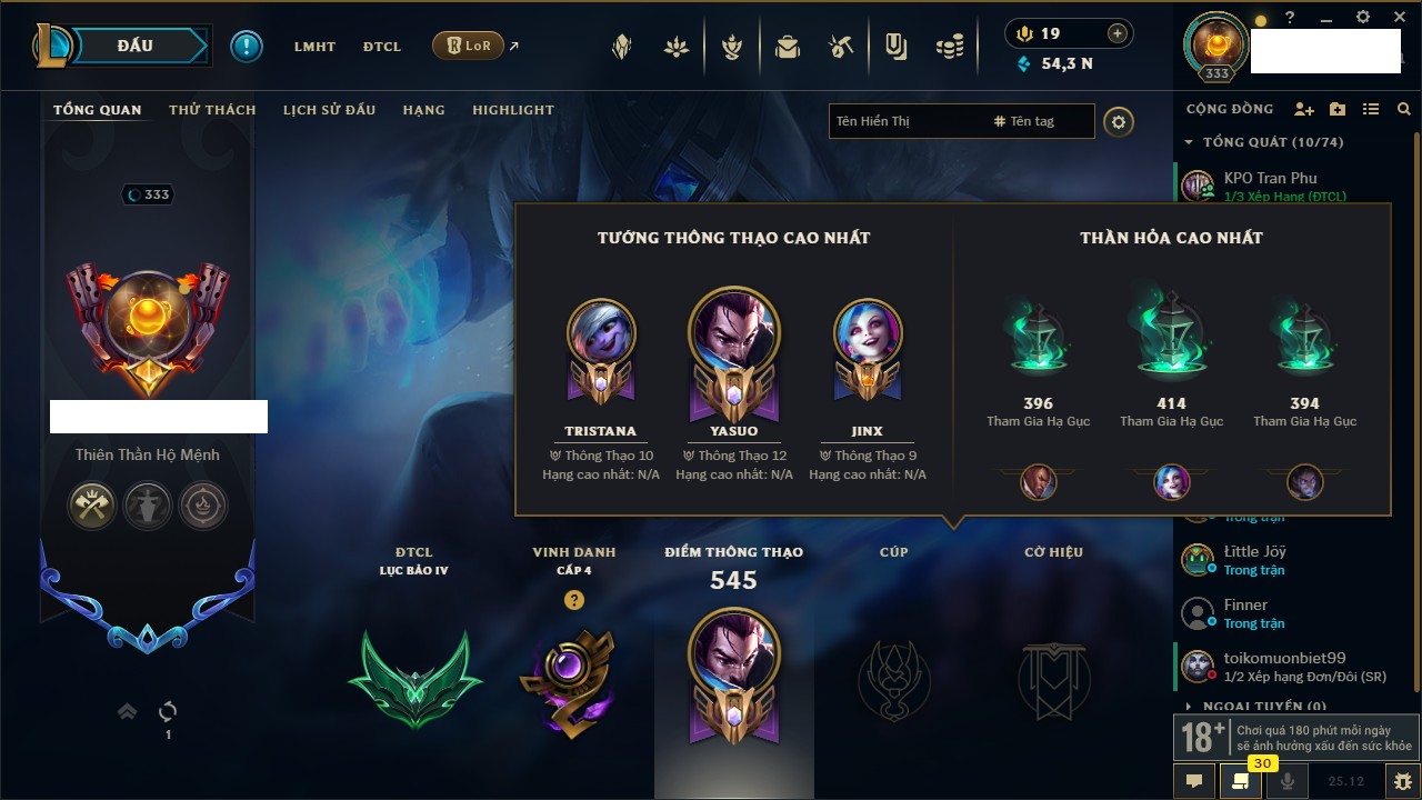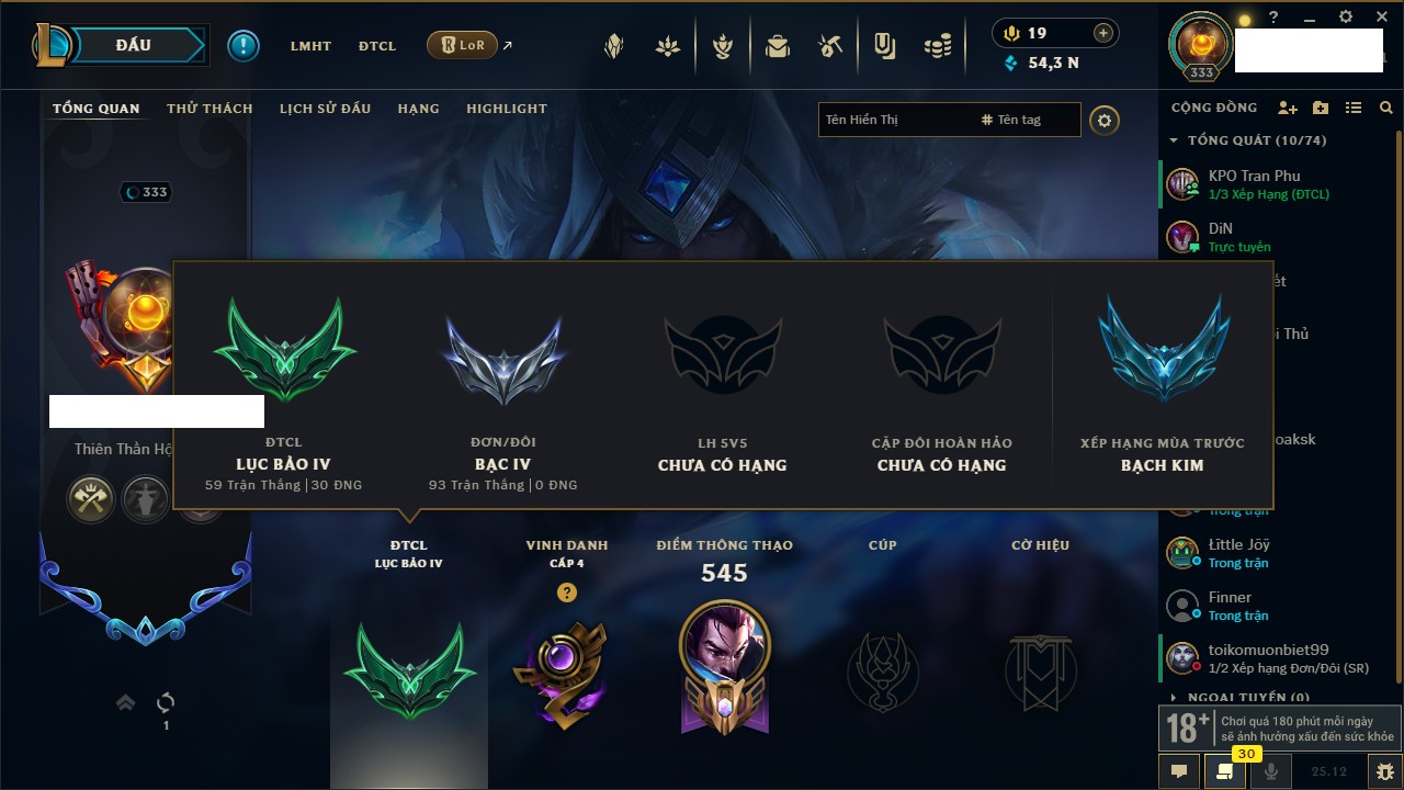 Rank Đơn: Đồng IV Khung: Chưa có khung Tướng: 171 - Còn 88838 THX Trang Phục: 103 Rank ĐTCL: Vàng IV Linh Thú: 139