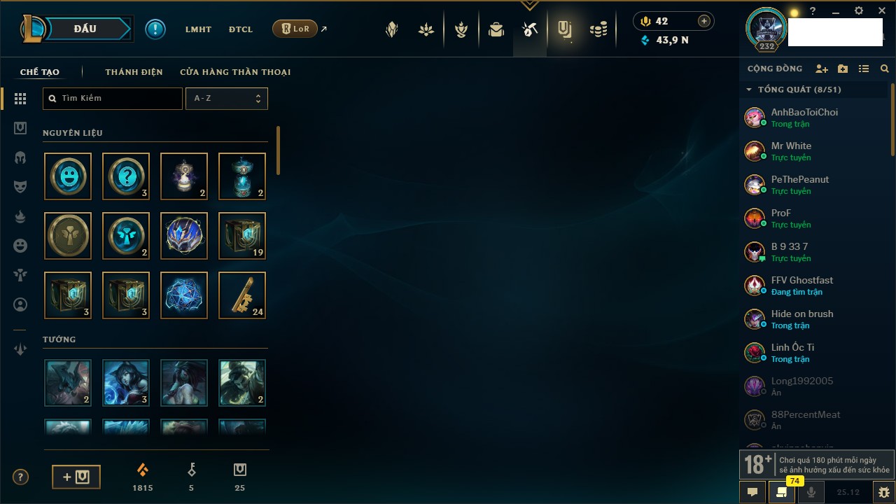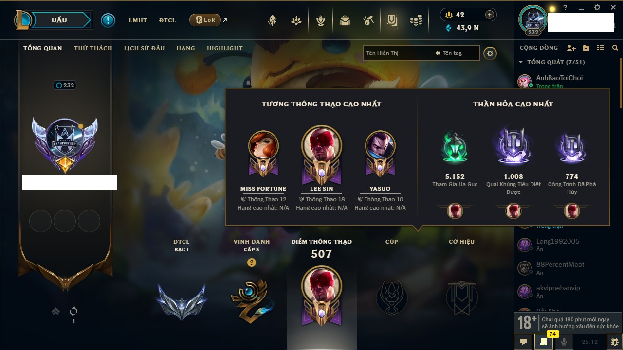 Rank Đơn: Bạch Kim IVKhung: Bạch kimTướng: 171 - Còn 154285 THXTrang Phục: 169Rank ĐTCL: Bạch Kim IILinh Thú: 60