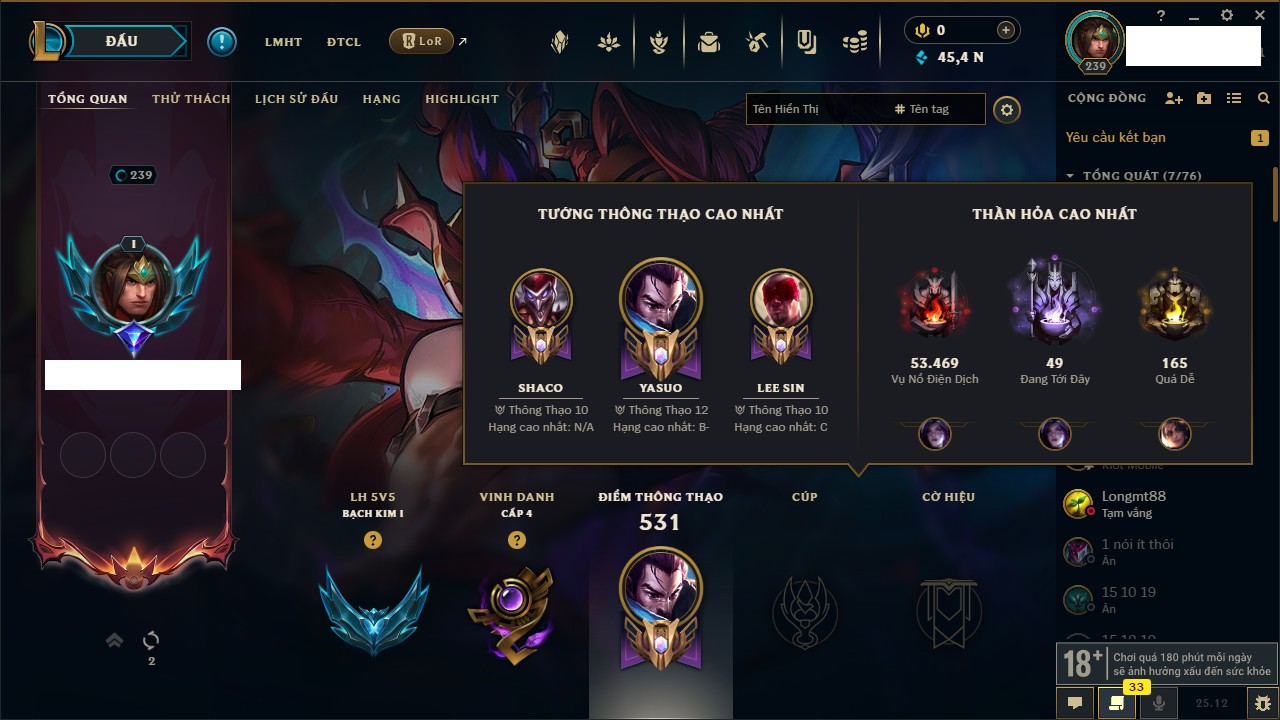 Rank Đơn: Đồng IKhung: ĐồngTướng: 168 - Còn 11447 THXTrang Phục: 245Rank ĐTCL: Chưa RankLinh Thú: 53