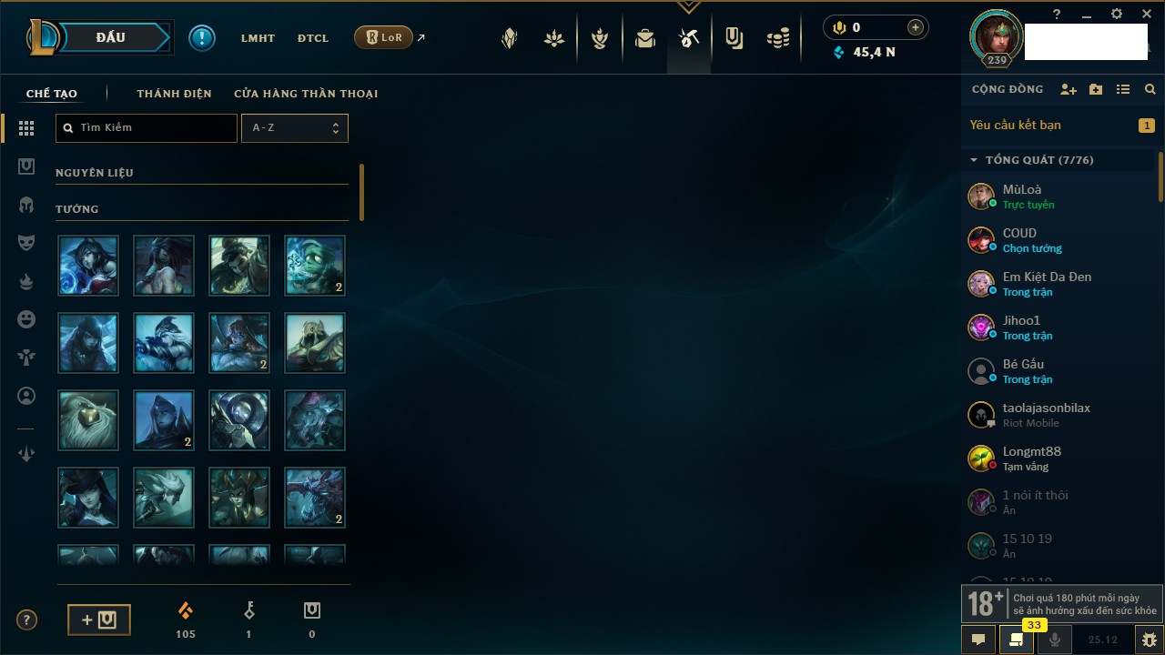 Rank Đơn: Vàng IIIKhung: BạcTướng: 171 - Còn 101359 THXTrang Phục: 88Rank ĐTCL: Kim Cương IVLinh Thú: 200