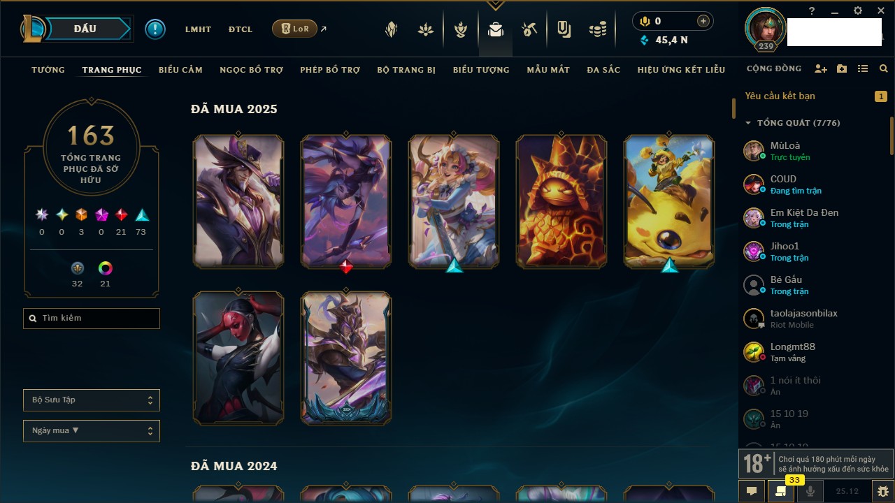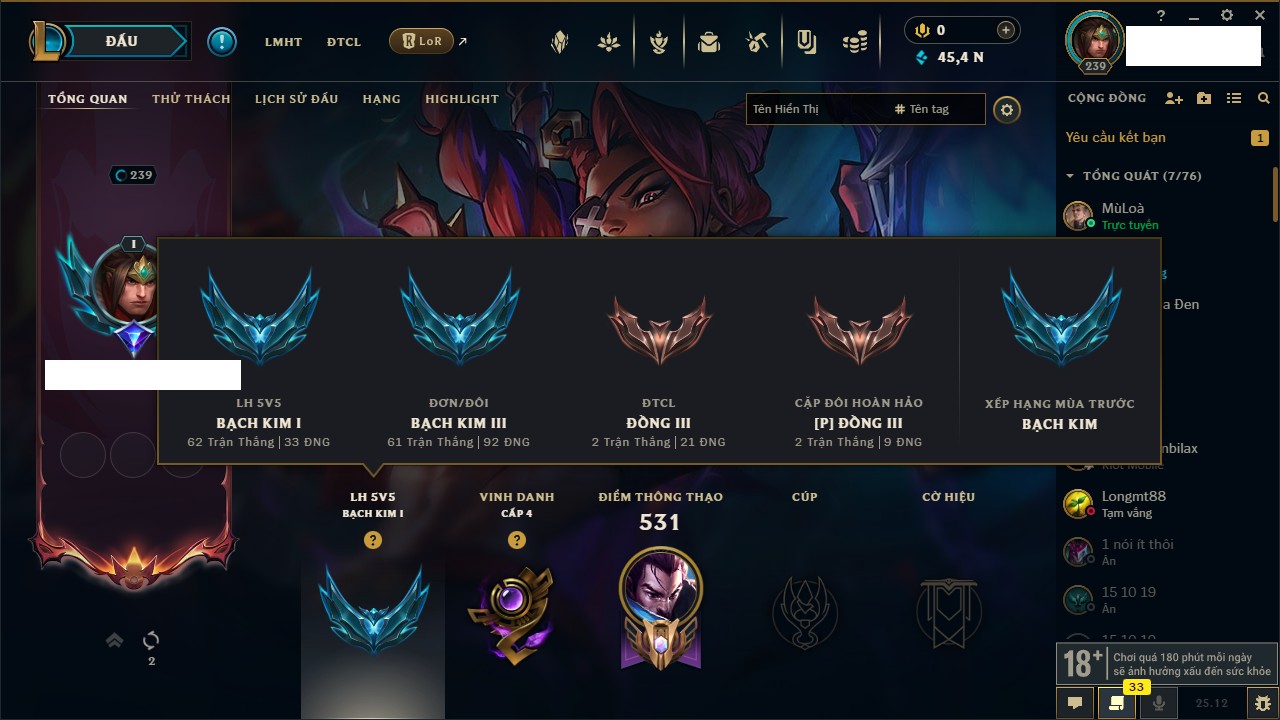 Rank Đơn: Đồng IIKhung: ĐồngTướng: 170 - Còn 66145 THXTrang Phục: 215Rank ĐTCL: Chưa RankLinh Thú: 52