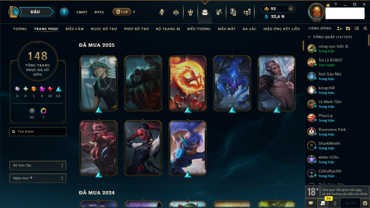 Rank Đơn: Chưa RankKhung: VàngTướng: 171 - Còn 489498 THXTrang Phục: 263Rank ĐTCL: Chưa RankLinh Thú: 39