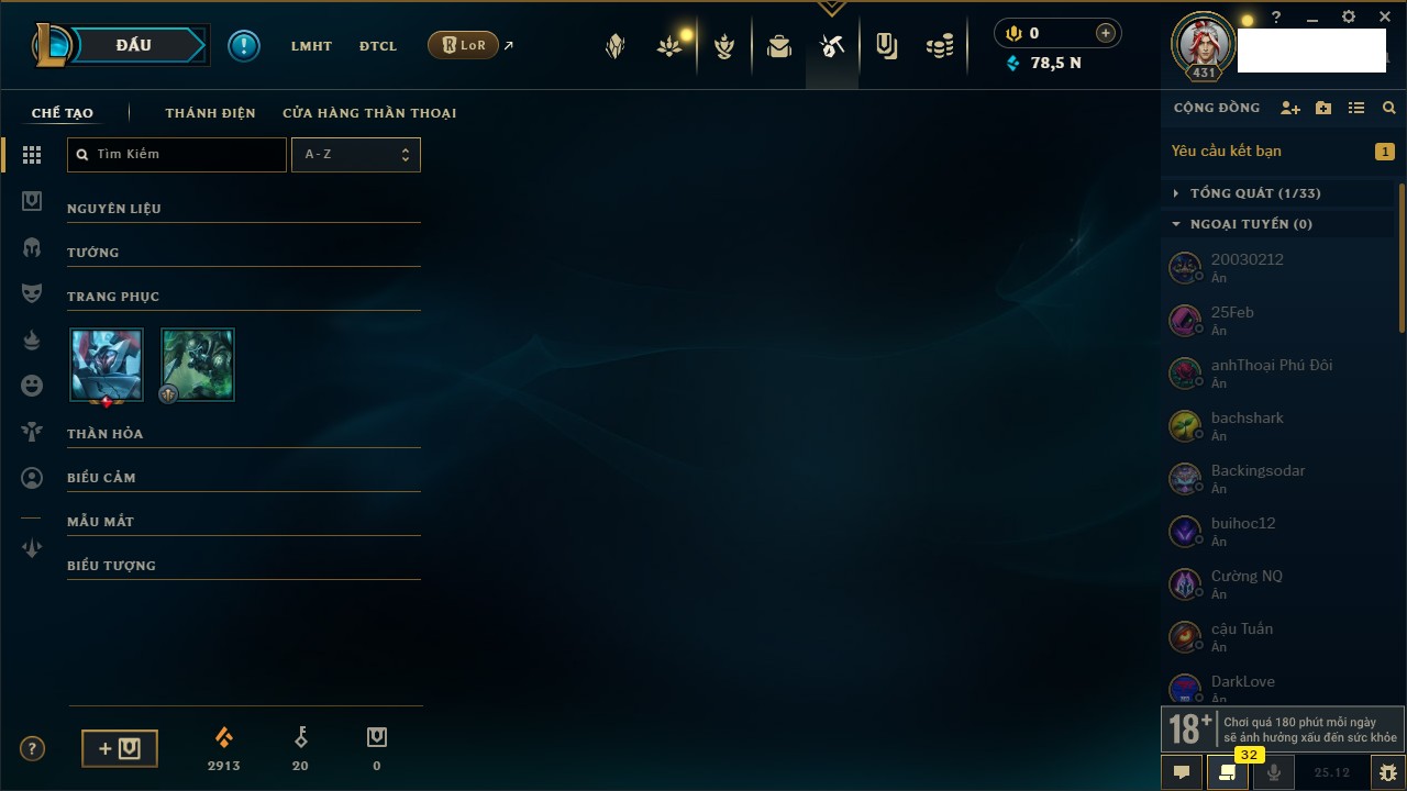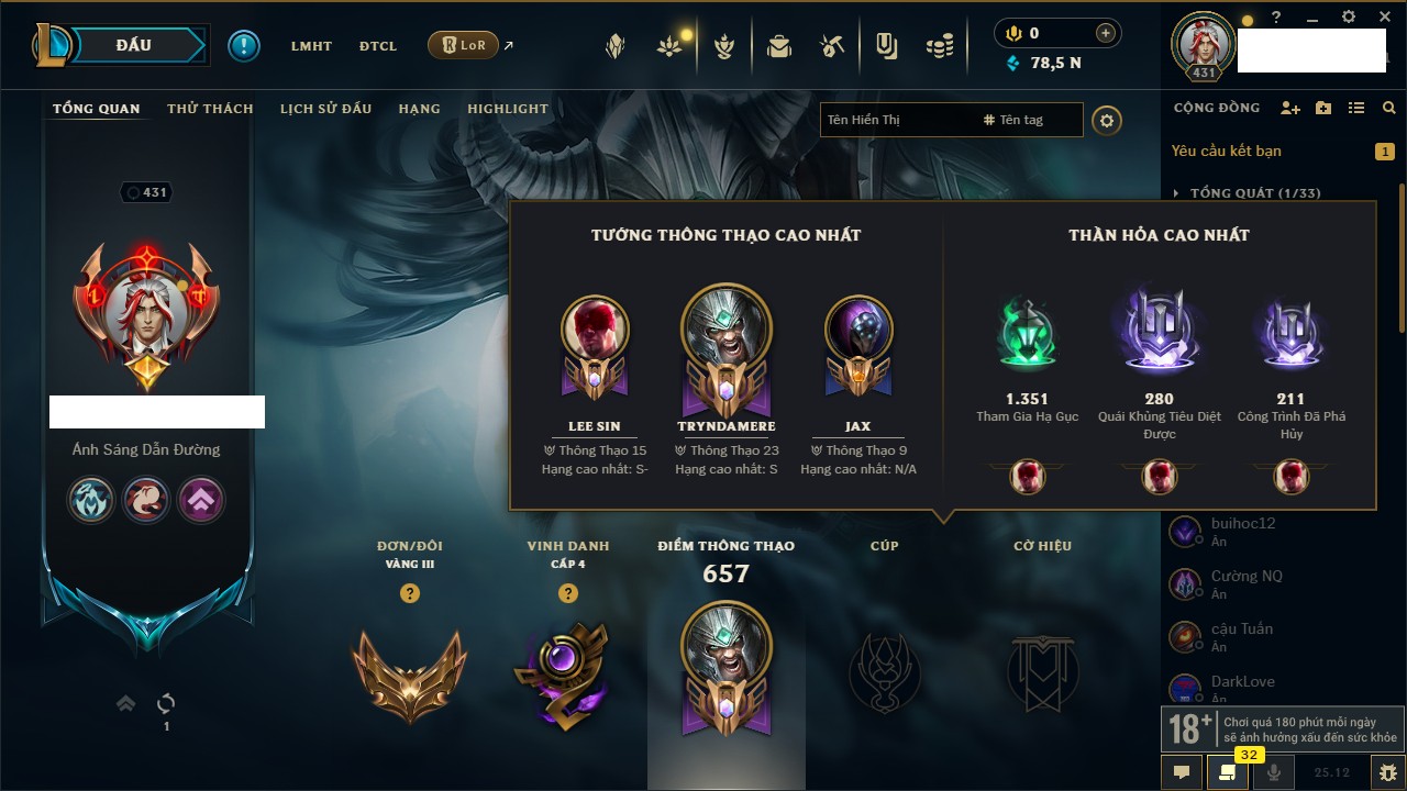 Rank Đơn: Bạc IIIKhung: BạcTướng: 171 - Còn 308470 THXTrang Phục: 164Rank ĐTCL: Chưa RankLinh Thú: 51
