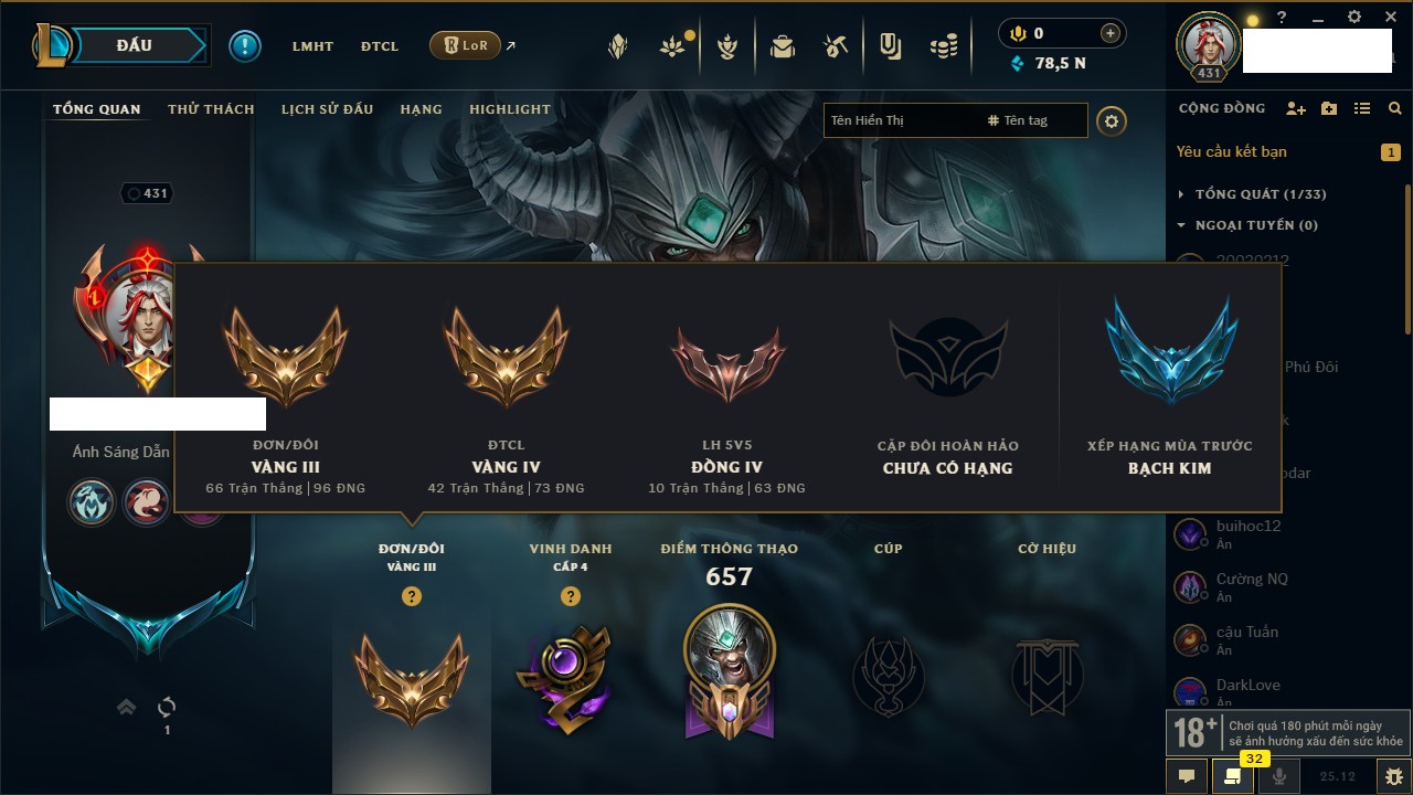 Rank Đơn: Bạc IIKhung: VàngTướng: 171 - Còn 70460 THXTrang Phục: 169Rank ĐTCL: Vàng ILinh Thú: 46