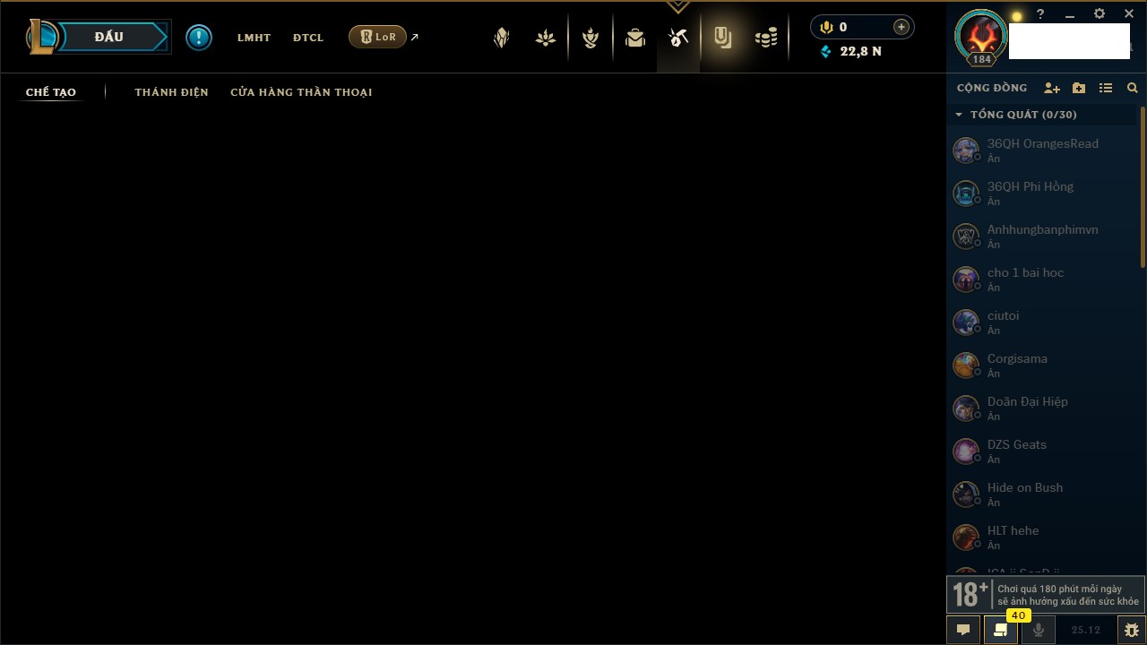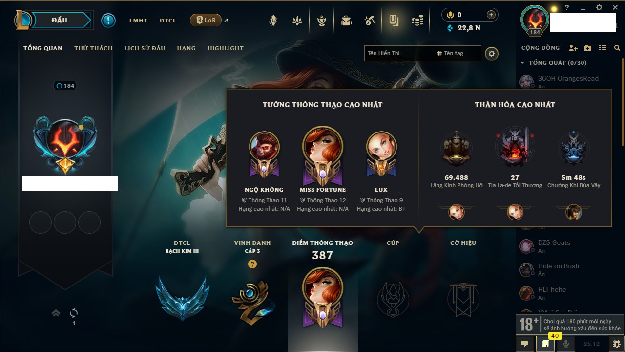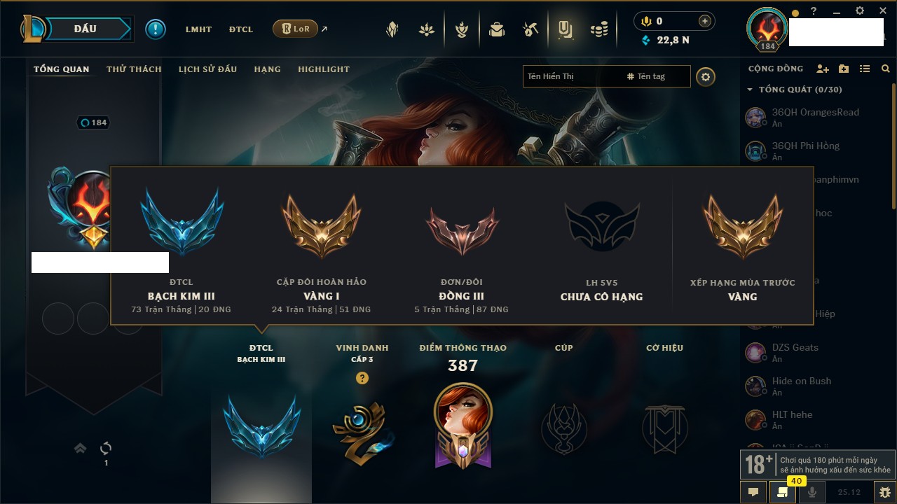 Rank Đơn: Đồng IV Khung: Chưa có khung Tướng: 171 - Còn 88838 THX Trang Phục: 103 Rank ĐTCL: Vàng IV Linh Thú: 139