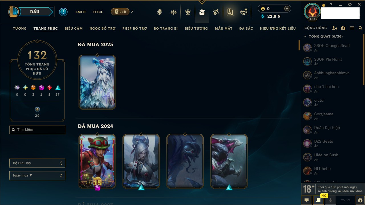 Rank Đơn: Sắt III Khung: Chưa có khung Tướng: 167 - Còn 8283 THX Trang Phục: 107 Rank ĐTCL: Chưa Rank Linh Thú: 64