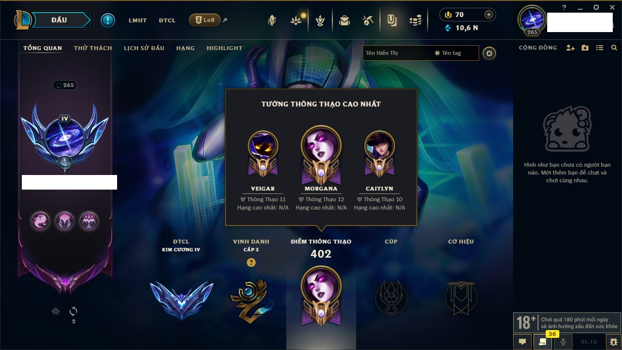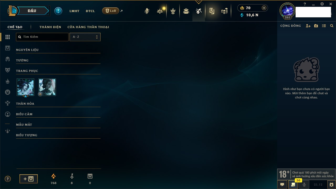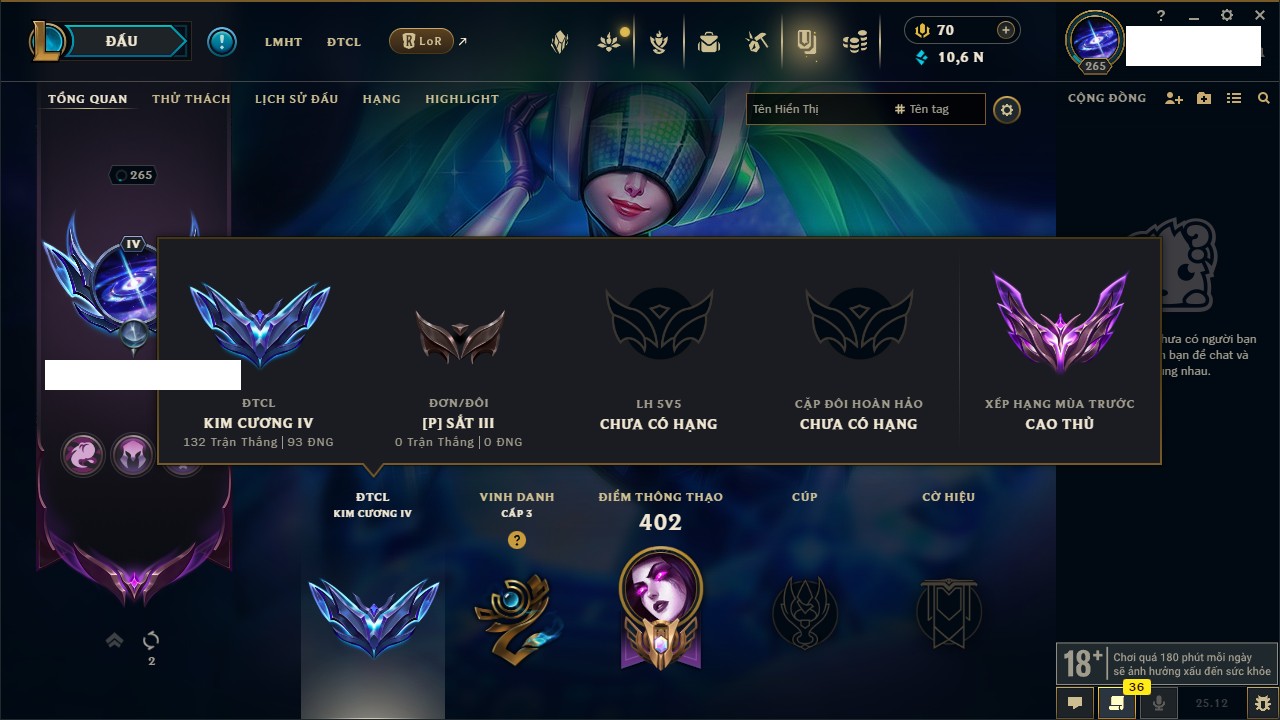 Rank Đơn: Lục Bảo IVKhung: VàngTướng: 171 - Còn 154648 THXTrang Phục: 203Rank ĐTCL: Bạch Kim IVLinh Thú: 69
